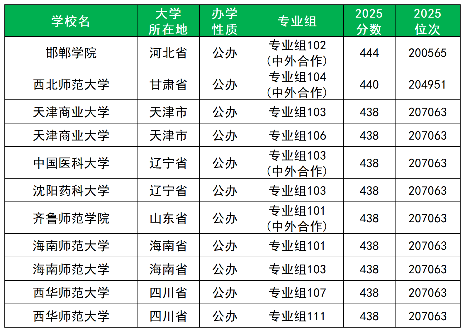 分数最高为444分,对应院校为邯郸学院(中外合作专业组102);其次为440分,对应院校为西北师范大学(中外合作专业组104)。