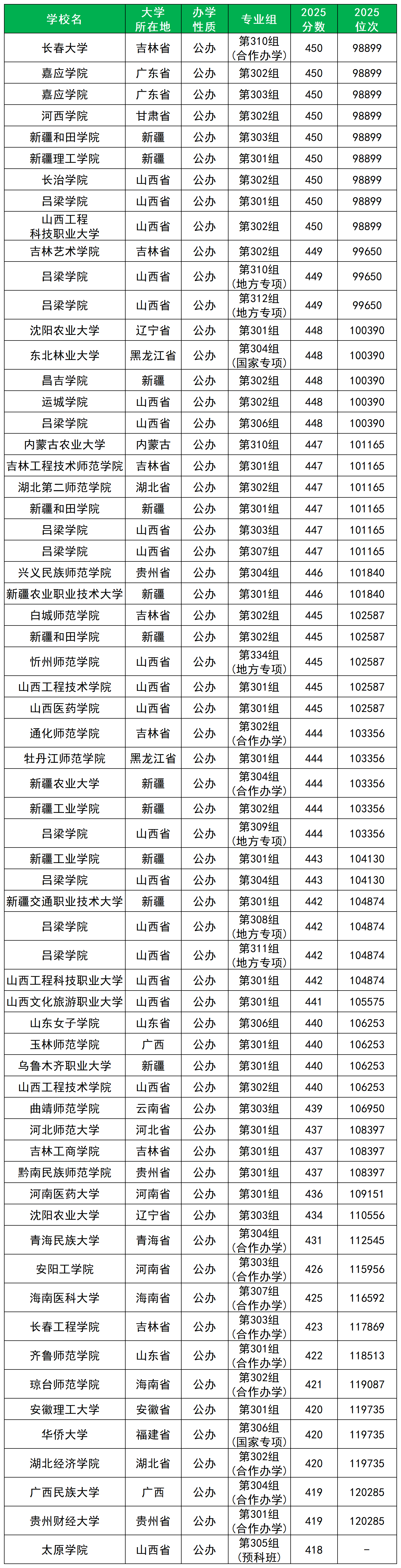 2025年山西物理组本科线为419分,从下文的表格可以看出,山西省400-450分的理科生能报考的公办本科院校有49所。