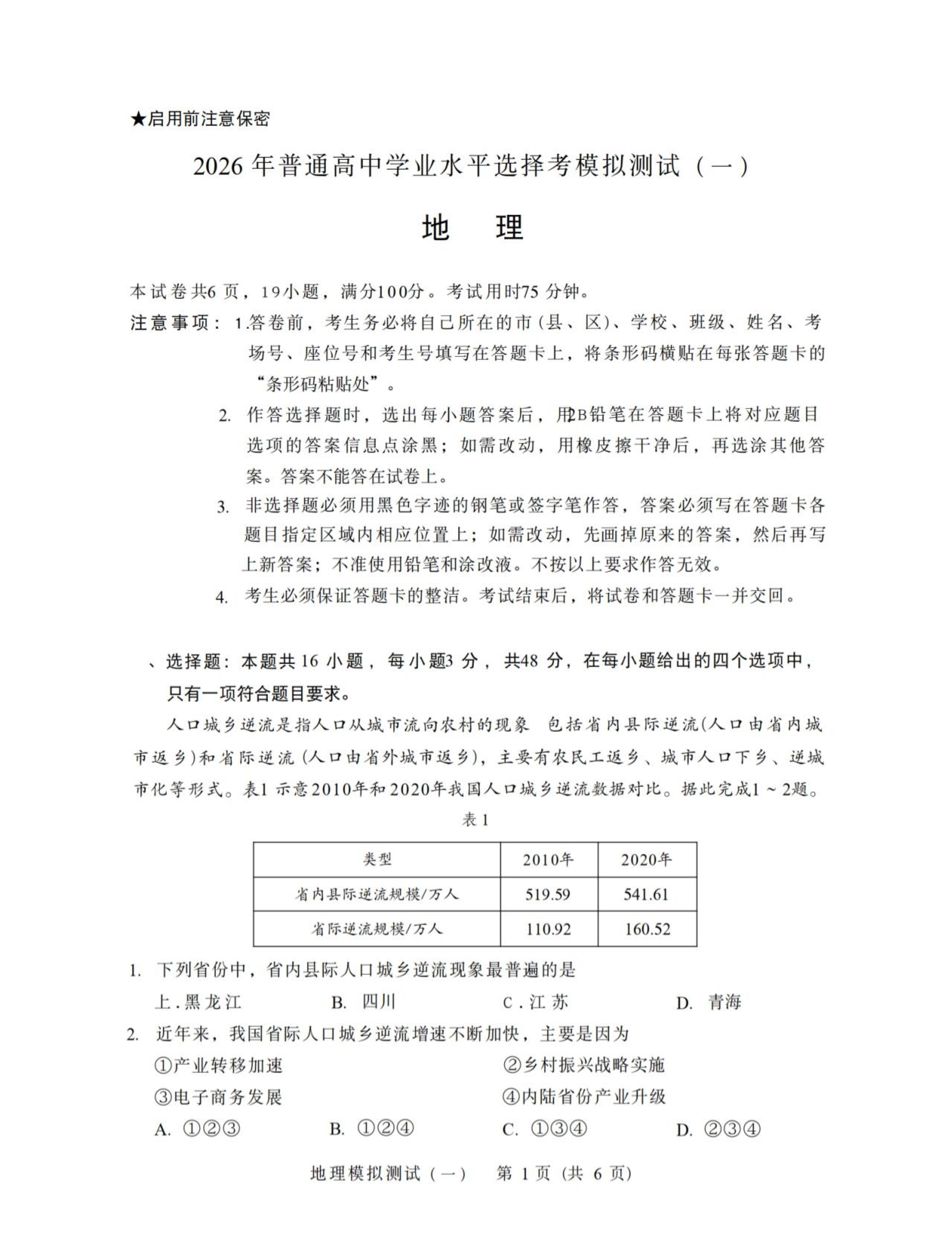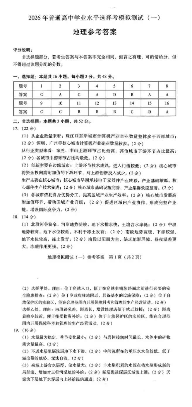 7、2026广东一模地理试题及参考答案