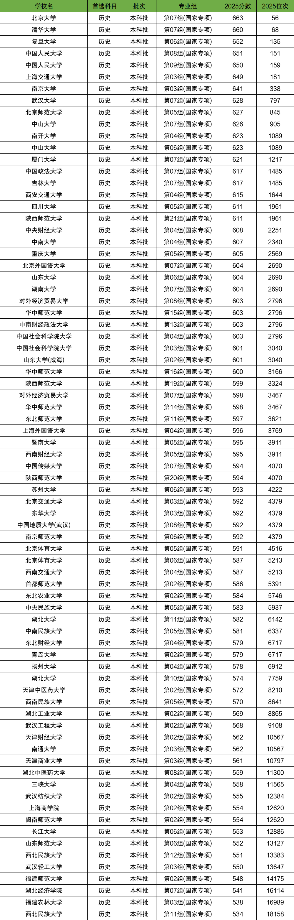 历史类分数线最高、最难考的是北京大学第07组,2025年最低分663分,最低位次56名。