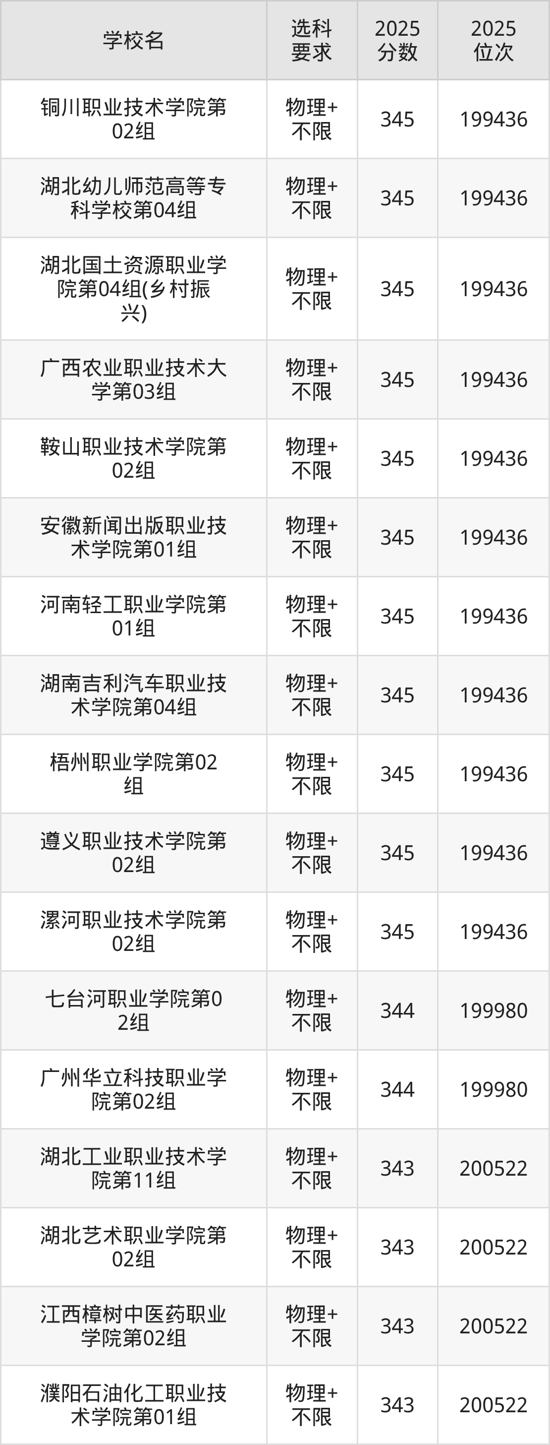 | 湖北工业职业技术 学院 | 151组 | 物理+ 不限 | 345 | 197579 |