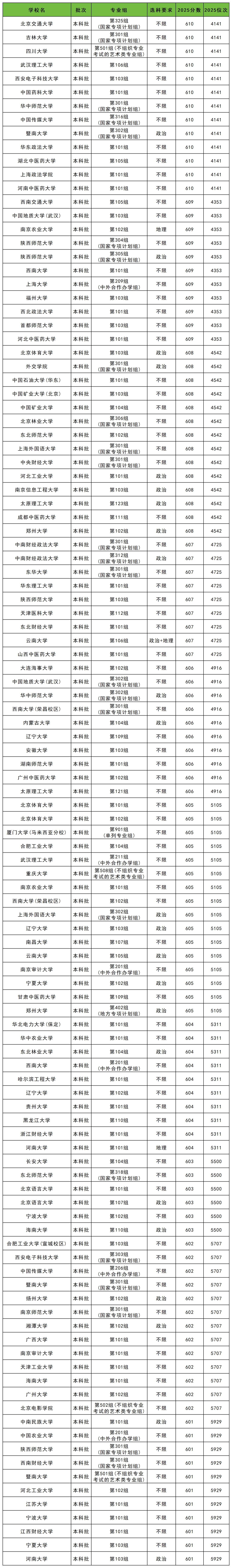 5千名左右最高位次对应的院校专业组有北京交通大学(325组,国家专项)、中国药科大学(101组)、河南中医药大学(101组)等,最低录取位次为4141位,位次对应分数为610分;