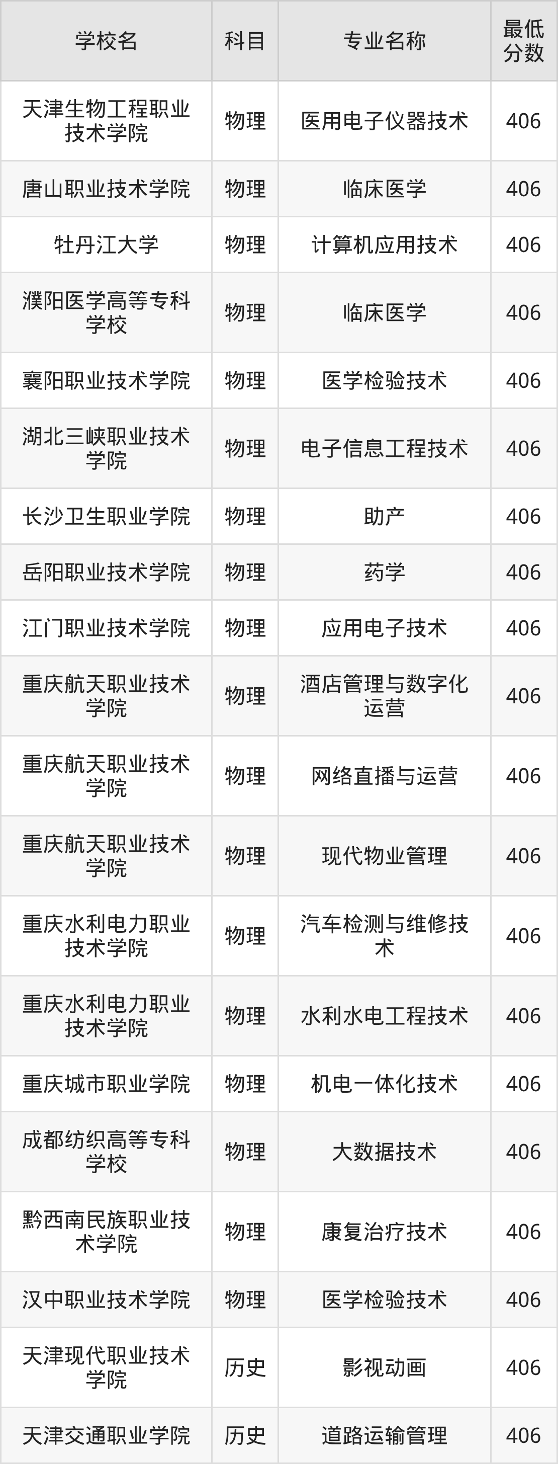 能上的专业有17个,包含热门专业:临床医学(406分可读唐山职业技术学院、濮阳医学高等专科学校)、电子信息工程技术(406分可读湖北三峡职业技术学院)、药学(406分可读岳阳职业技术学院),冷门专业:助产(406分可读长沙卫生职业学院)、酒店管理与数字化运营(406分可读重庆航天职业技术学院)、康复治疗技术(406分可读黔西南民族职业技术学院)等专业。
