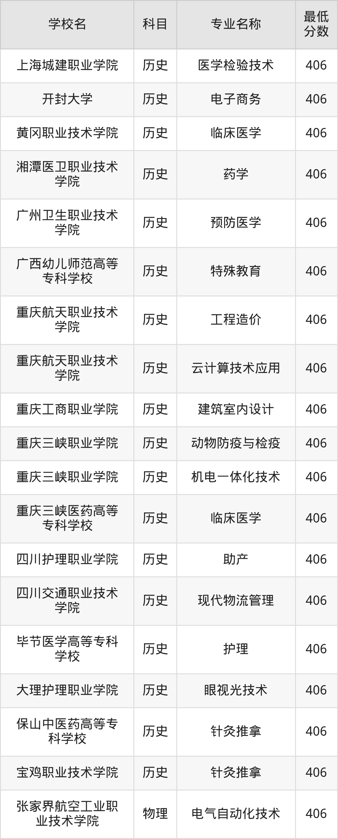 下方表格展示的是重庆高考406分对应的全部公办大专学校名单: