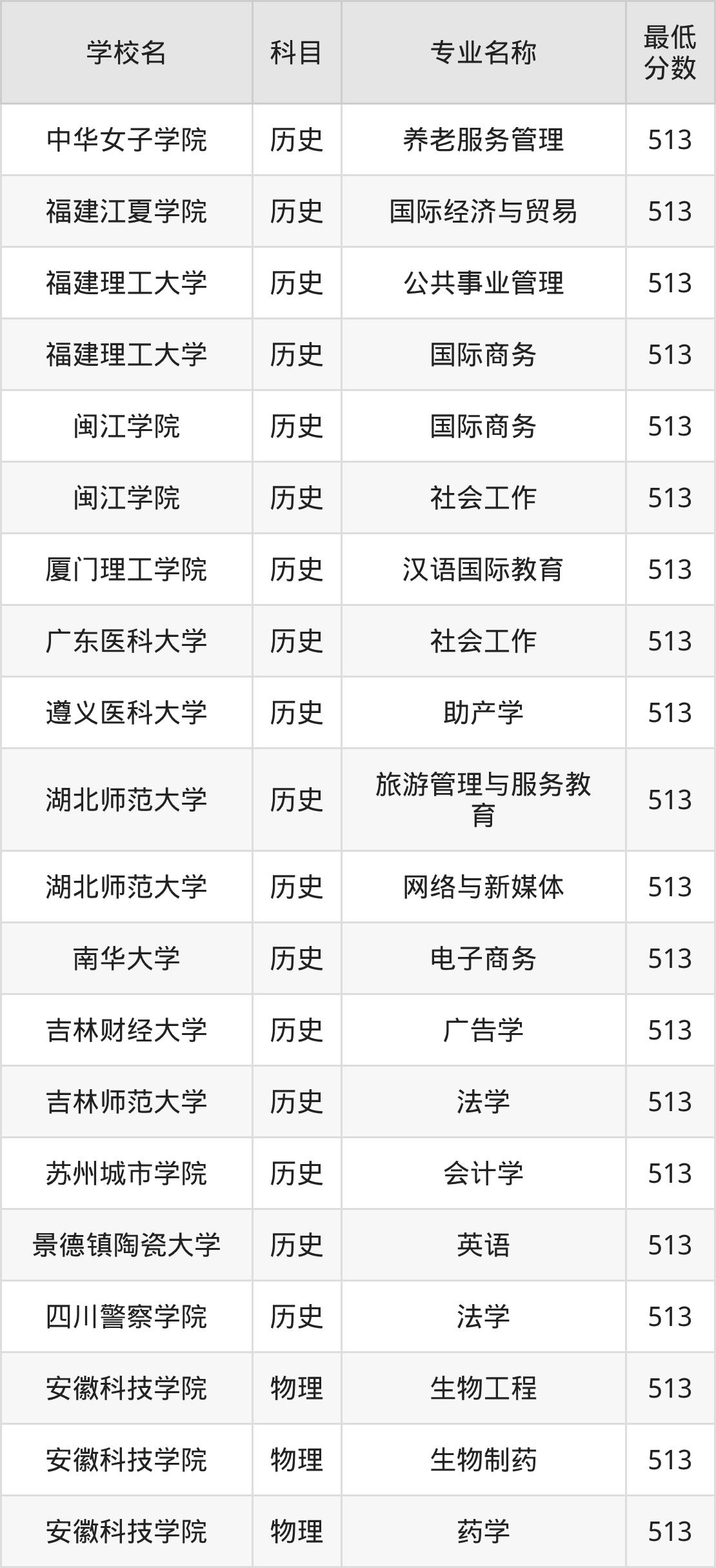 | 安徽科技学院 | 生物工程 | 物理 | 513 |
