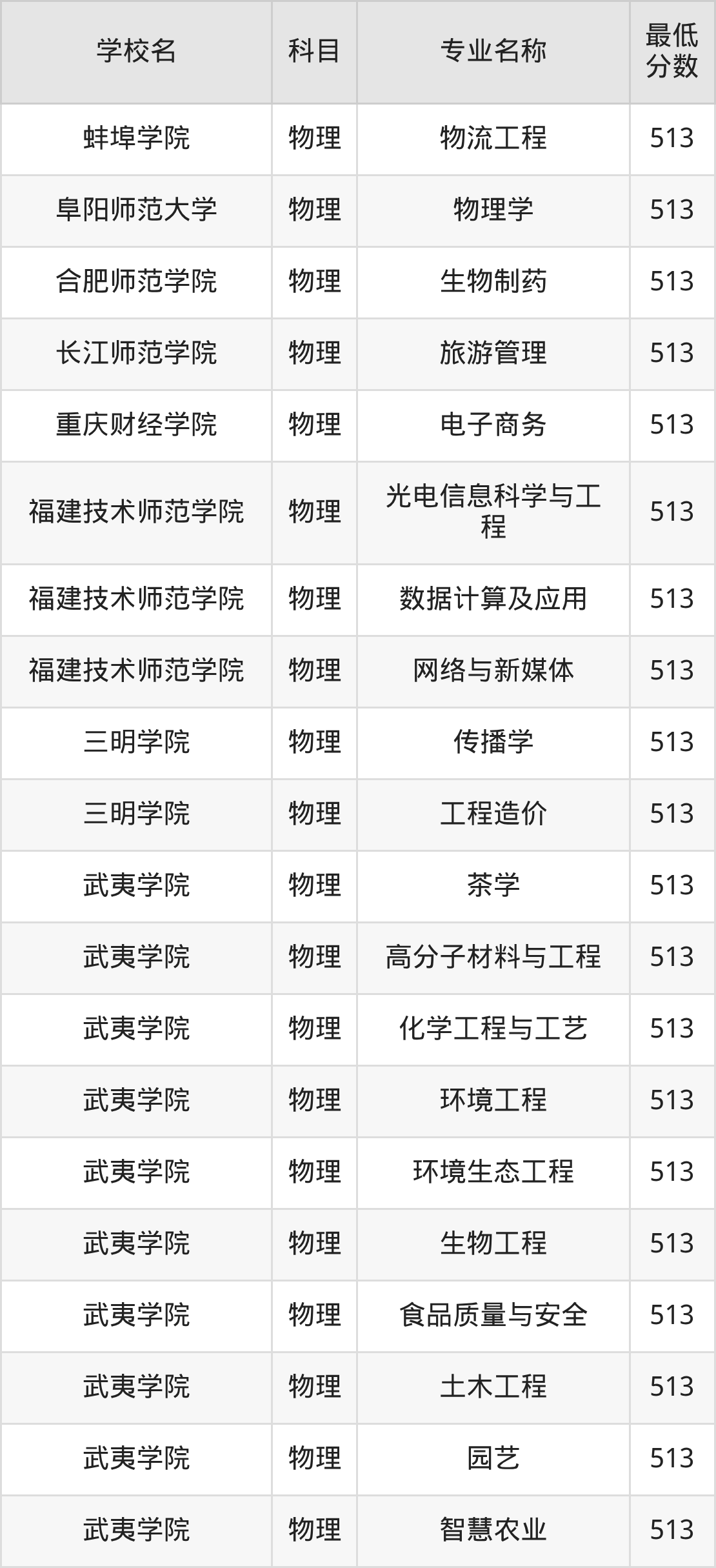 | 武夷学院 | 生物工程 | 物理 | 513 |
