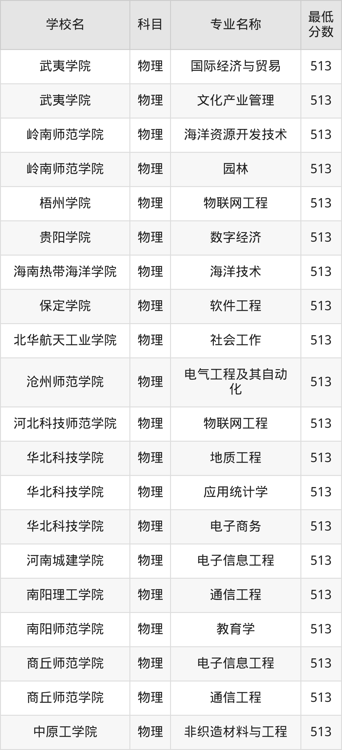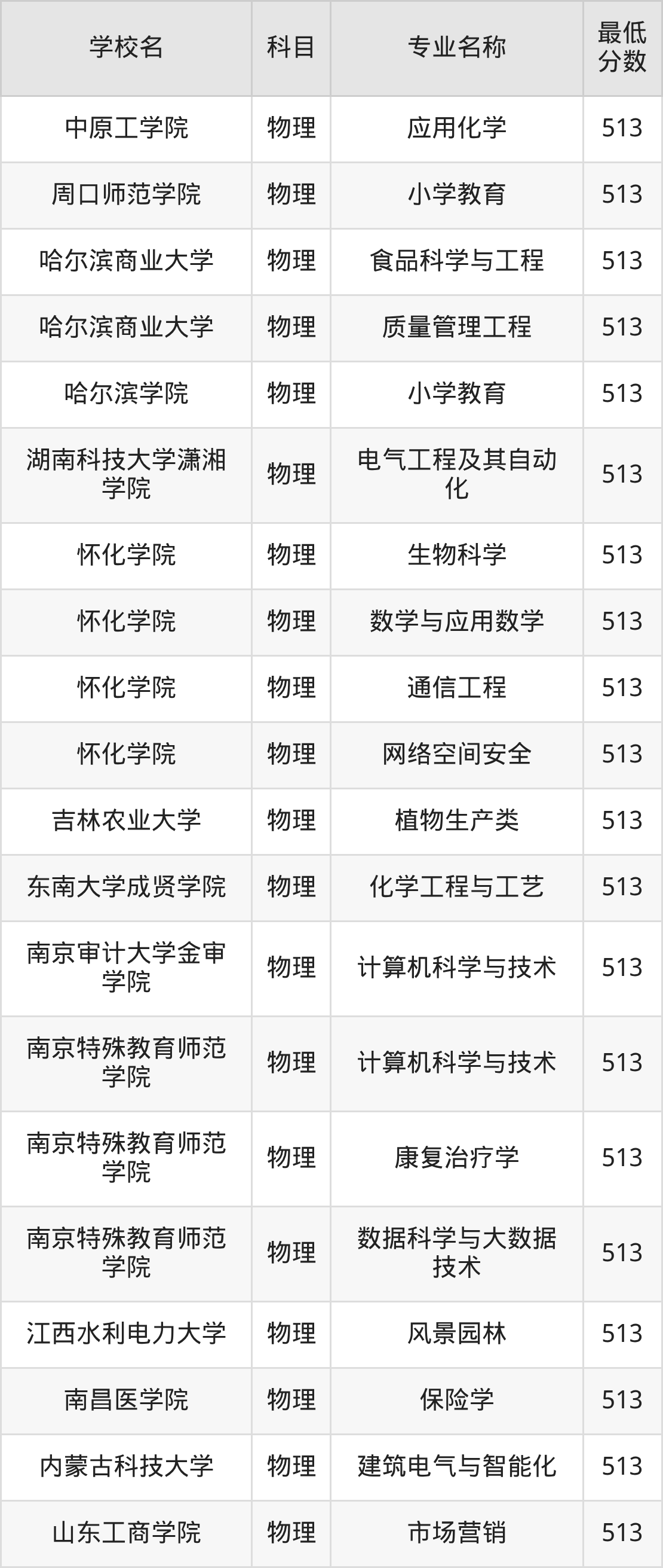 能上的专业有63个,包含超级热门专业:软件工程(513分可读保定学院)、电气工程及其自动化(513分可读沧州师范学院、湖南科技大学潇湘学院、山西工程技术学院)、电子信息工程(513分可读河南城建学院、商丘师范学院、太原工业学院),超级冷门专业:生物工程(513分可读安徽科技学院、武夷学院)、茶学(513分可读武夷学院)、化学工程与工艺(513分可读武夷学院、东南大学成贤学院)等专业。