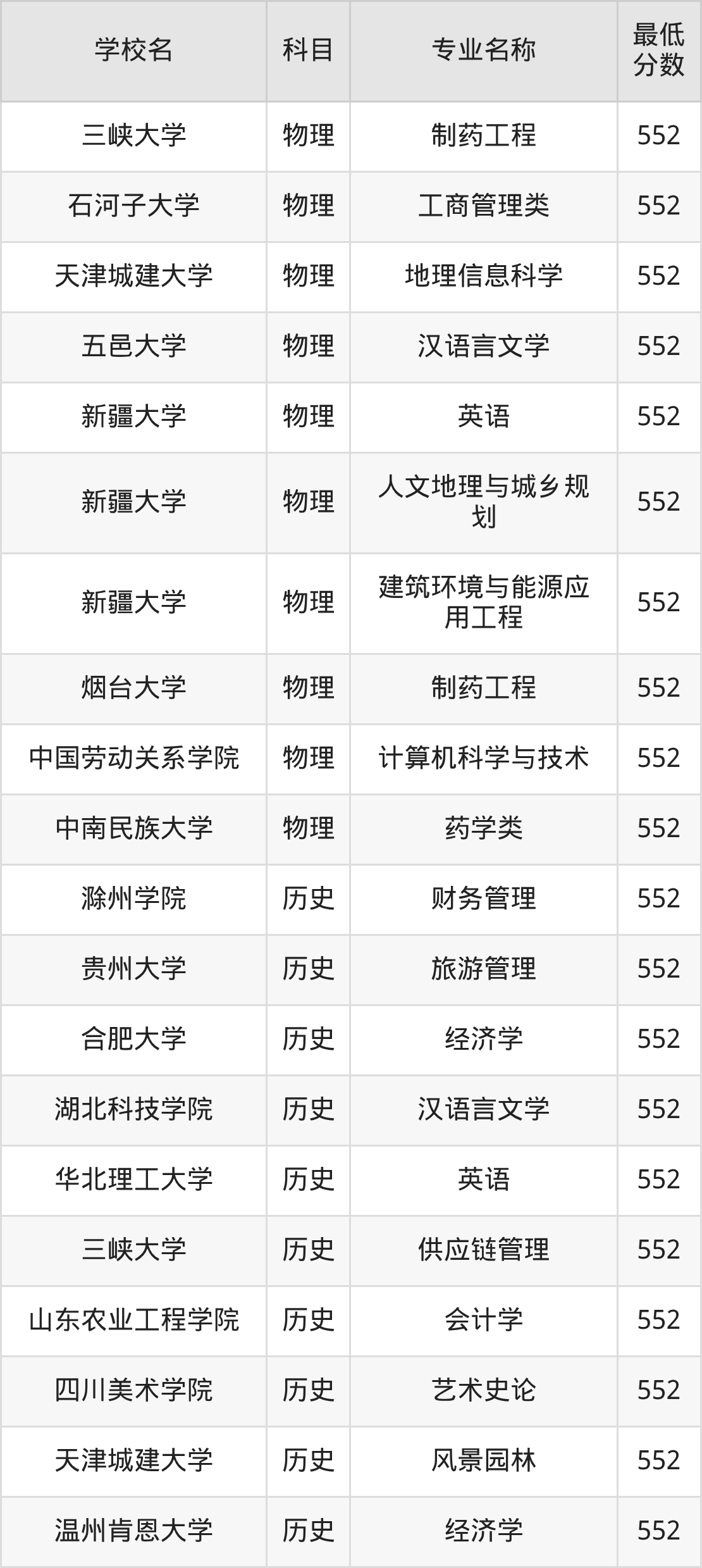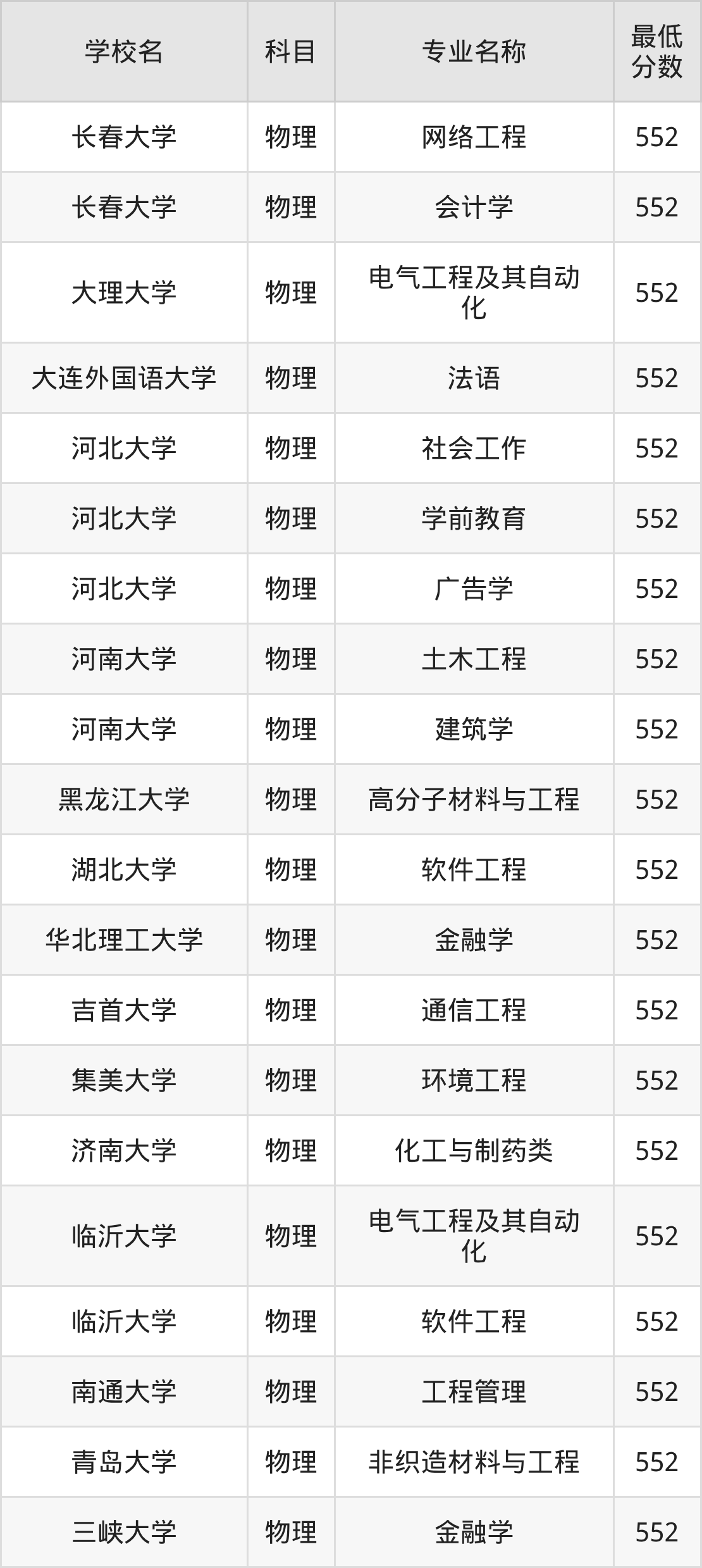 能上的专业有26个,包含超级热门专业:会计学(552分可读长春大学)、电气工程及其自动化(552分可读大理大学、临沂大学)、软件工程(552分可读湖北大学、临沂大学),超级冷门专业:土木工程(552分可读河南大学)、建筑学(552分可读河南大学)、环境工程(552分可读集美大学)等专业。