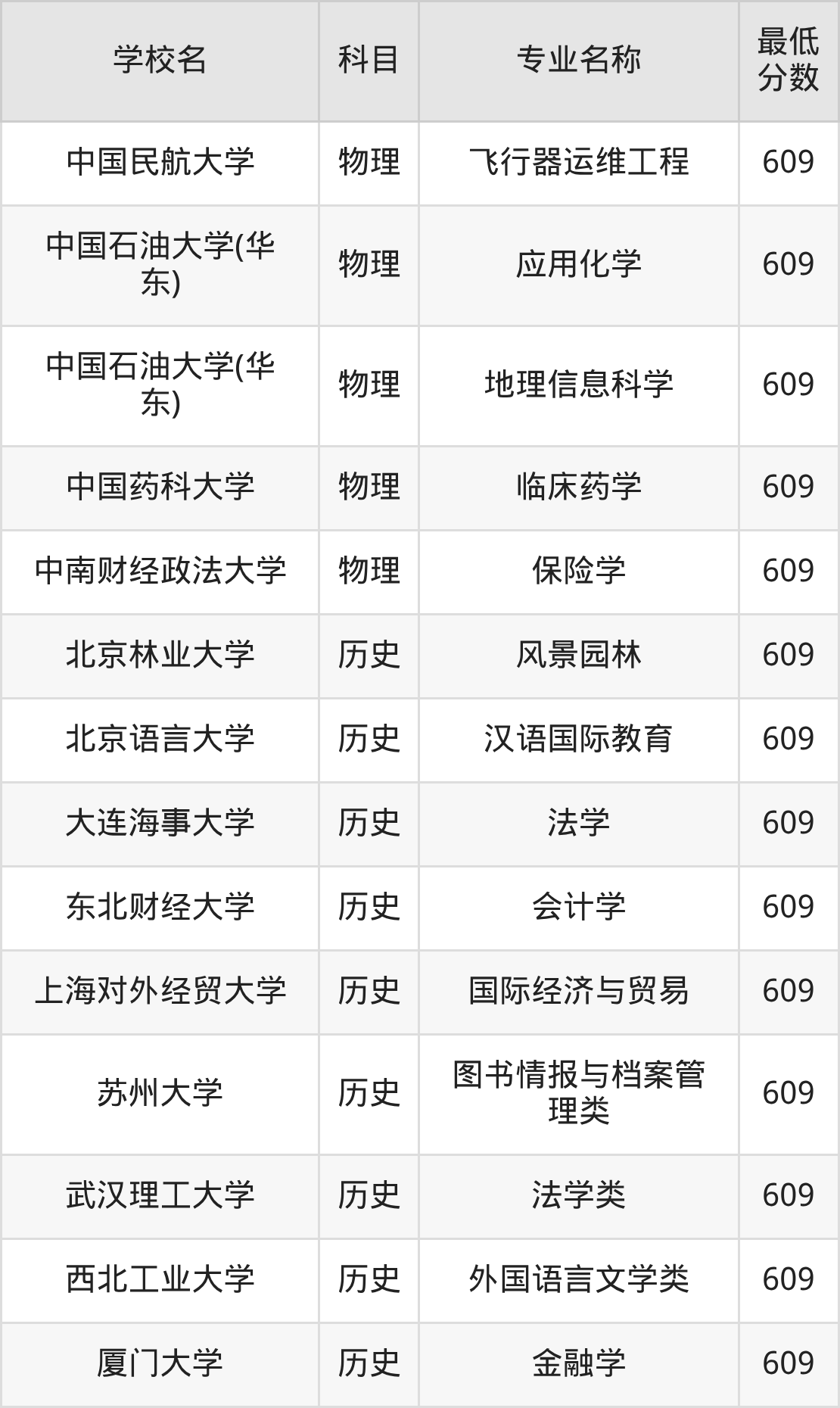 最低分为609分的本科大学有39所、专业有47个。
