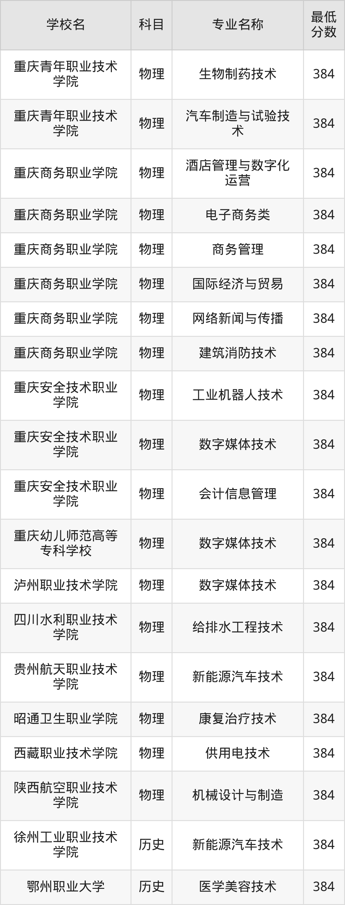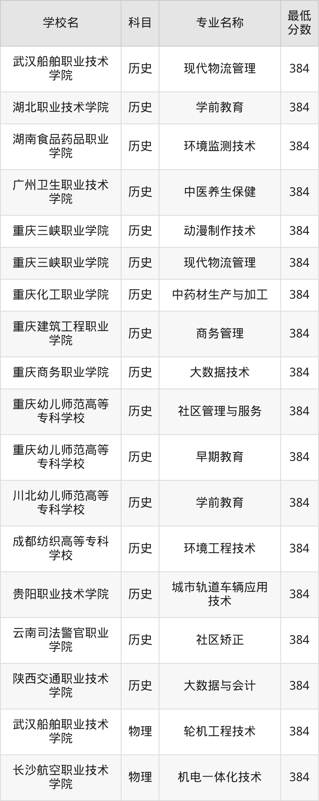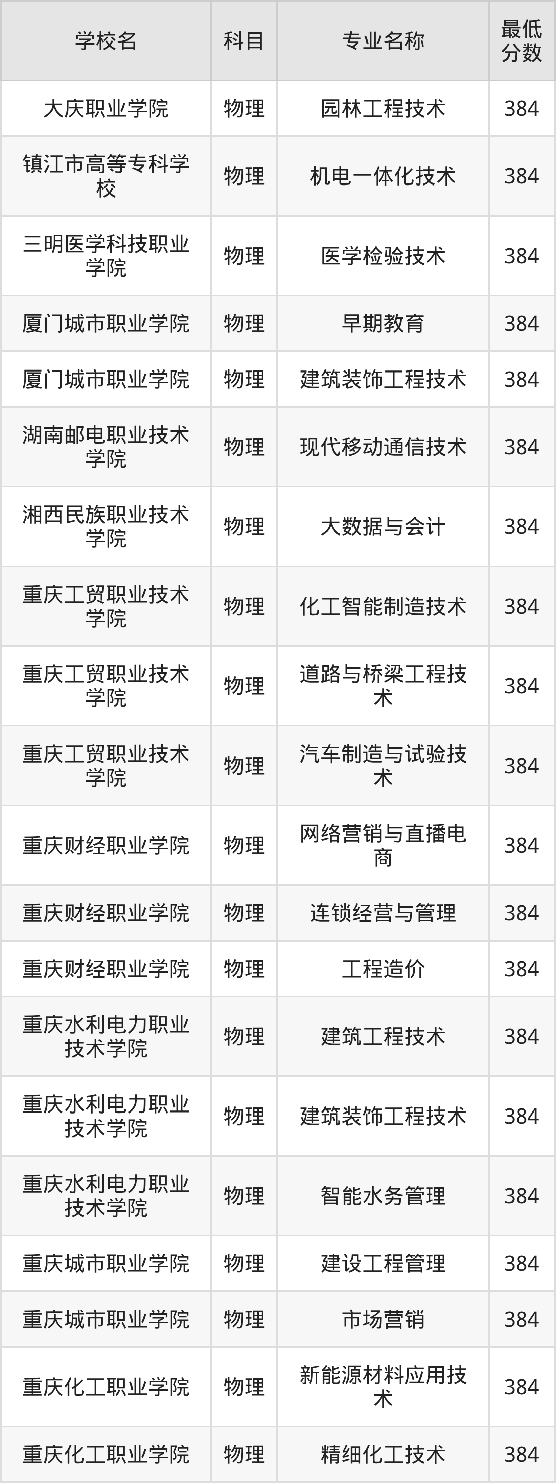 下方表格展示的是重庆高考384分对应的全部公办大专学校名单: