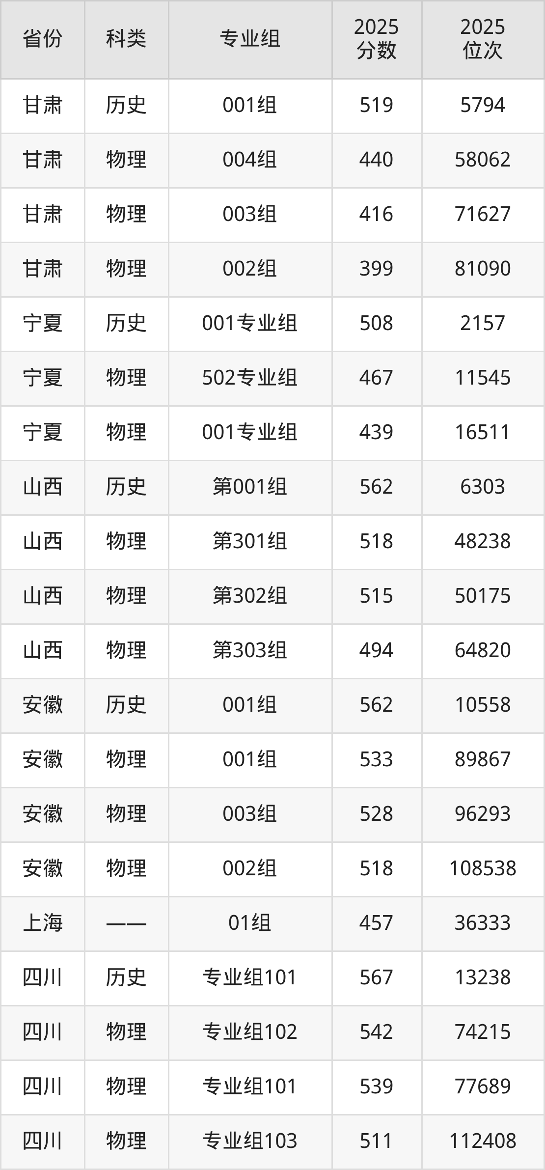 2、甘肃:最低分399分,对应最低分专业组为物理类002组,位次81090名;