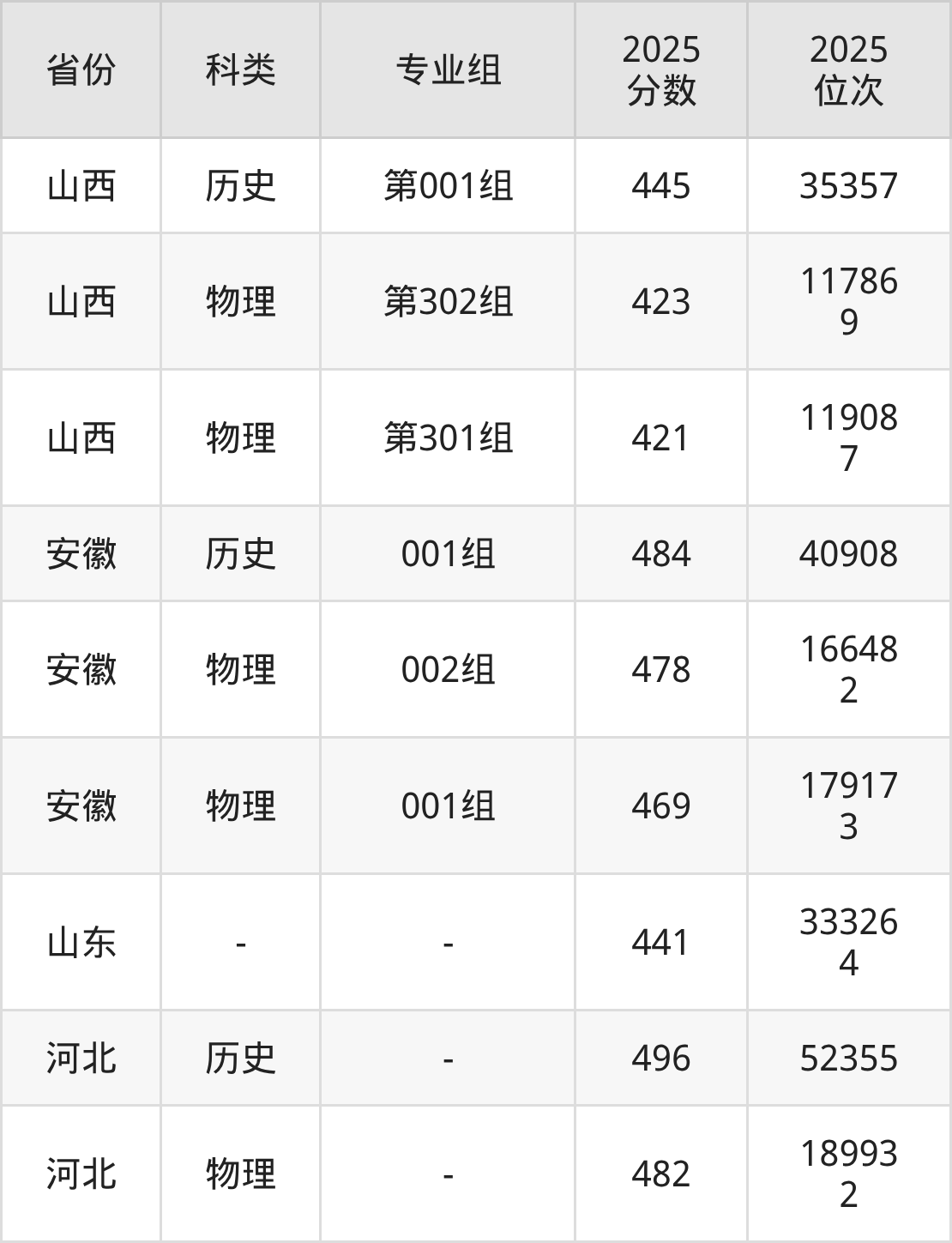 2025山东华宇工学院在各省录取最低分在421分到496分之间不等,其中分数门槛最低的是山西,最高的是河北。下面展示山东华宇工学院录取分数线最低的5个省份(含最低分专业组及位次):