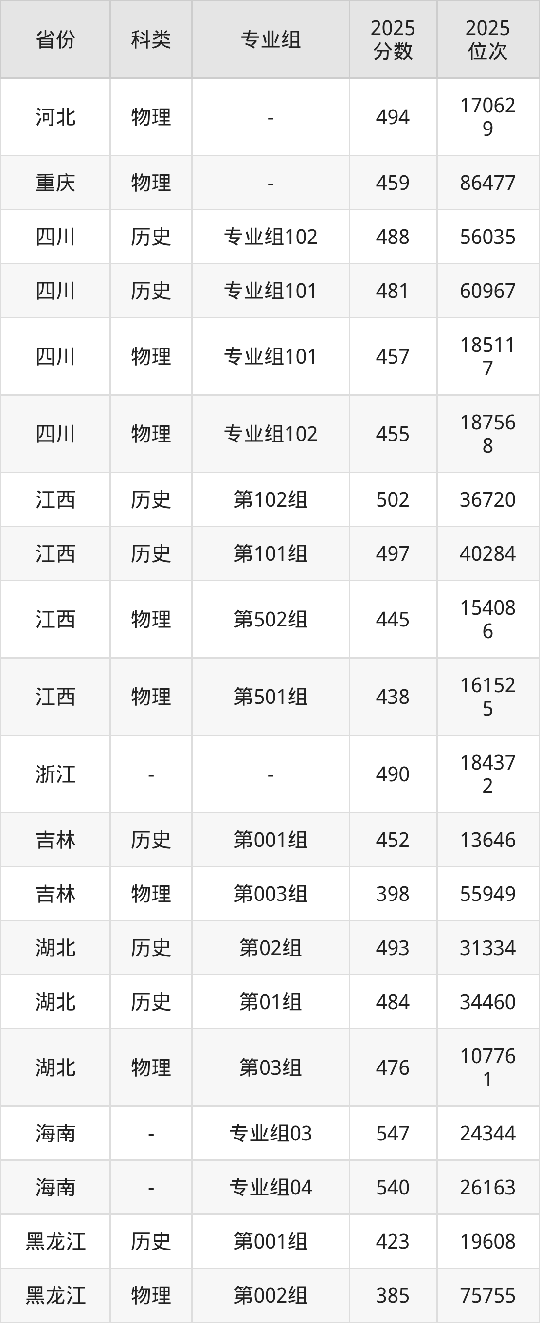 1、黑龙江:最低分385分,对应最低分专业组为物理类第002组,位次75755名;