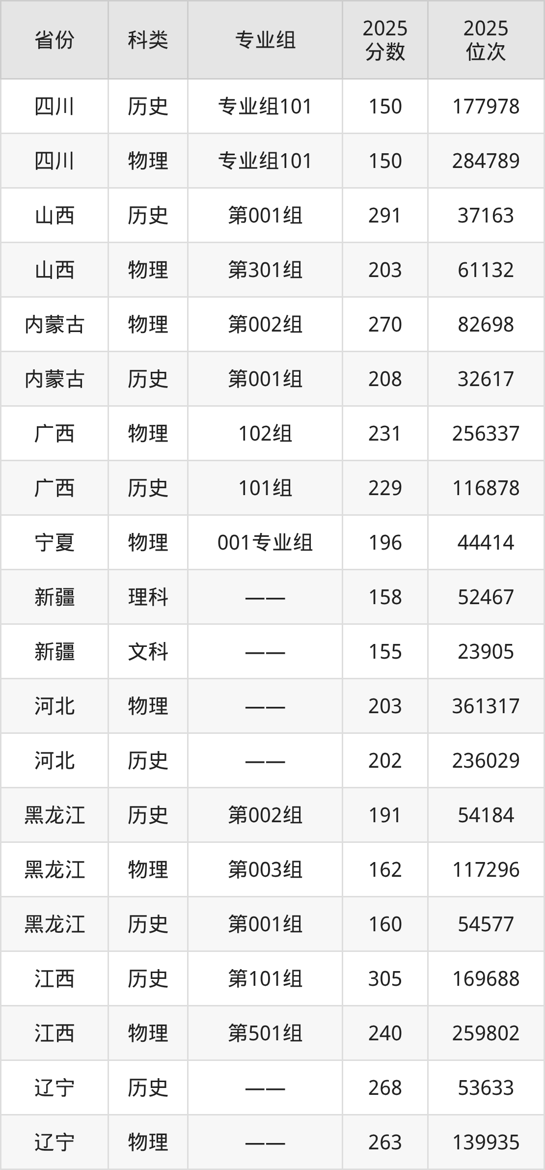2025天津滨海汽车工程职业学院在各省录取最低分在150分到305分之间不等,其中分数门槛最低的是四川,最高的是甘肃。下面展示天津滨海汽车工程职业学院录取分数线最低的5个省份(含最低分专业组及位次):