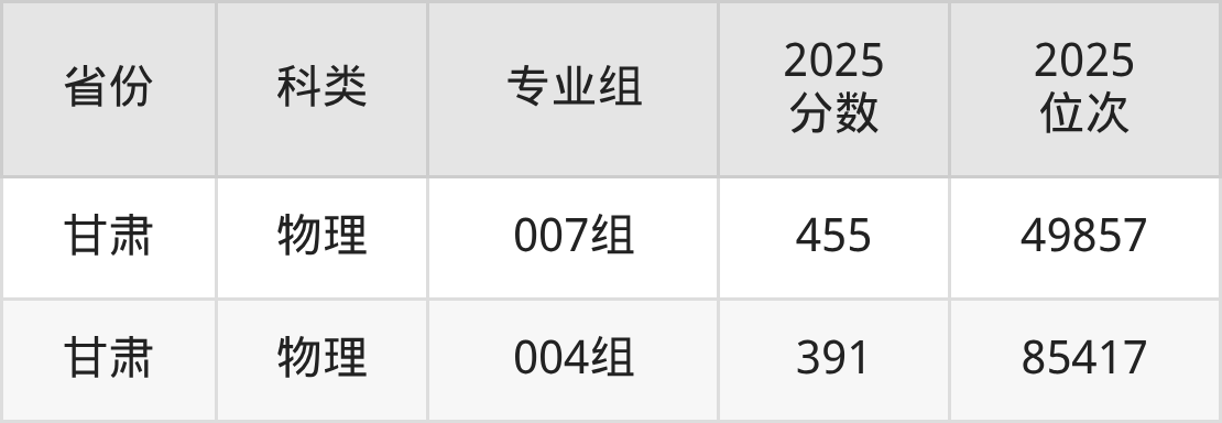3、甘肃:最低分391分,对应最低分专业组为物理类004组,位次85417名;