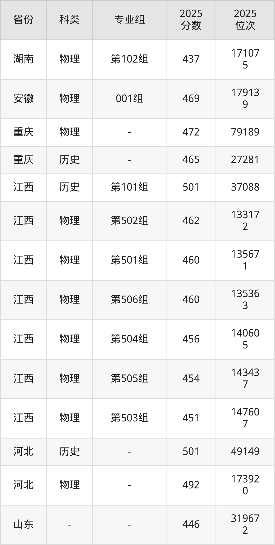 4、湖南:最低分437分,对应最低分专业组为物理类第102组,位次171075名;