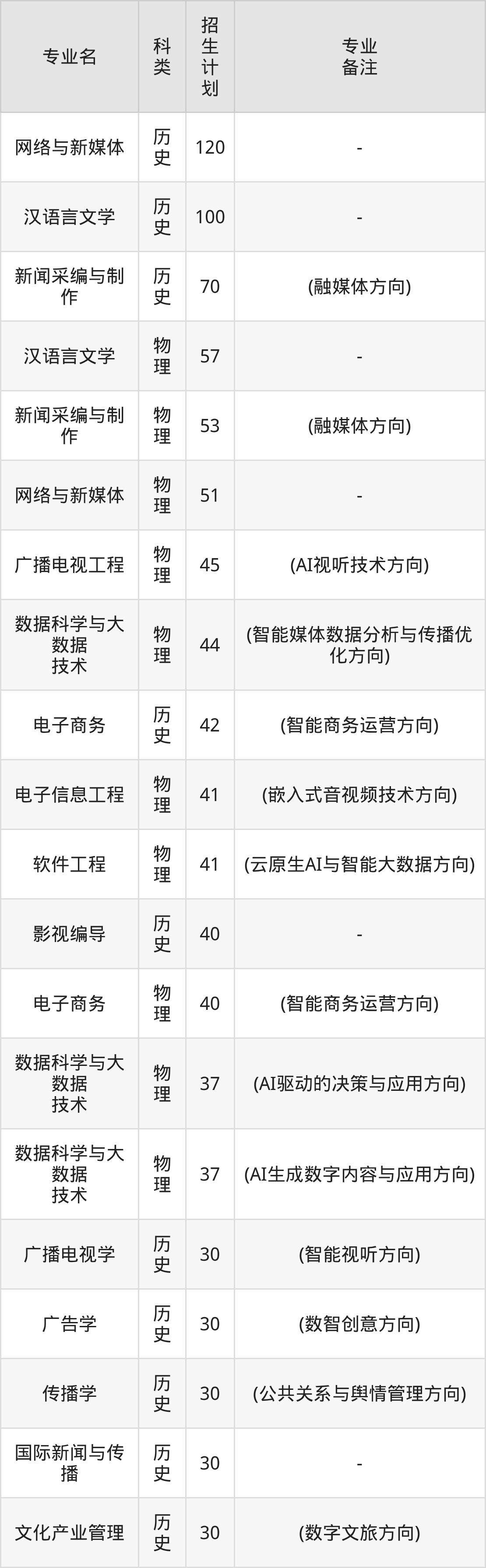 武汉传媒学院2025全国招生计划表显示: 在湖北招1226人、江西招109人、广西招56人、广东招54人、贵州招38人。
