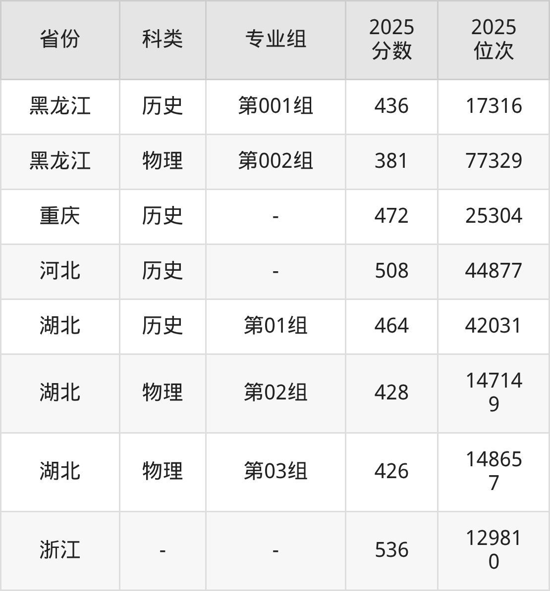 2025武汉传媒学院在各省录取最低分在381分到536分之间不等,其中分数门槛最低的是黑龙江,最高的是浙江。下面展示武汉传媒学院录取分数线最低的5个省份(含最低分专业组及位次):