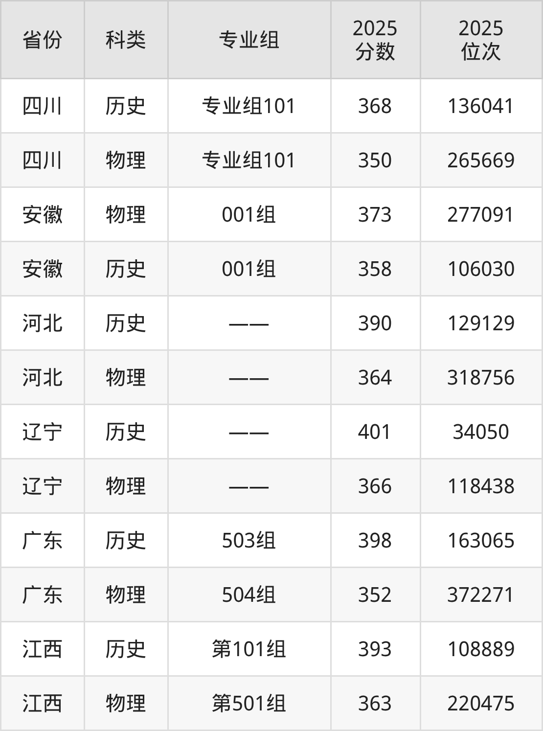 1、四川:最低分350分,对应最低分专业组为物理类专业组101,位次265669名;