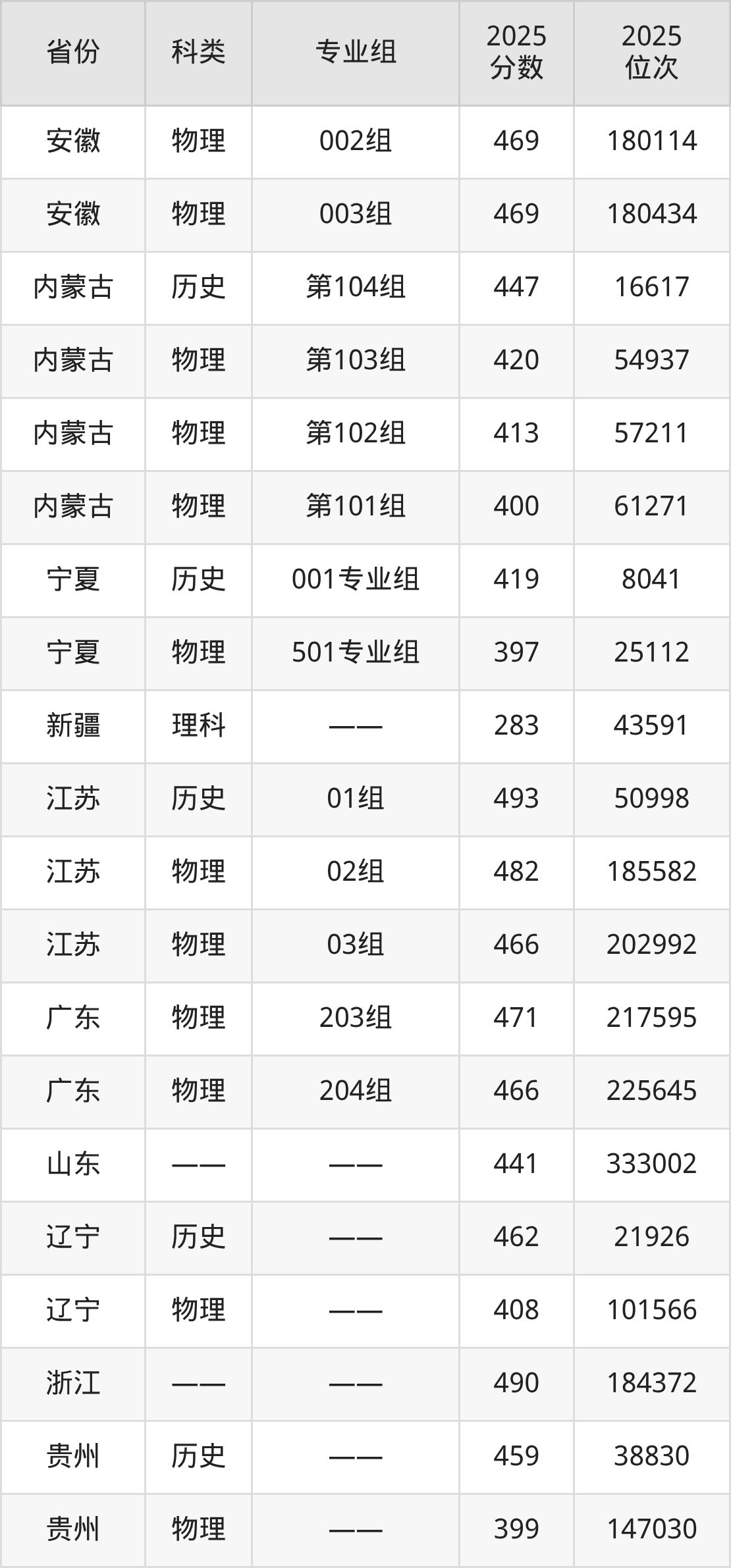 2025齐鲁理工学院在各省录取最低分在283分到507分之间不等,其中分数门槛最低的是新疆,最高的是河北。下面展示齐鲁理工学院录取分数线最低的5个省份(含最低分专业组及位次):