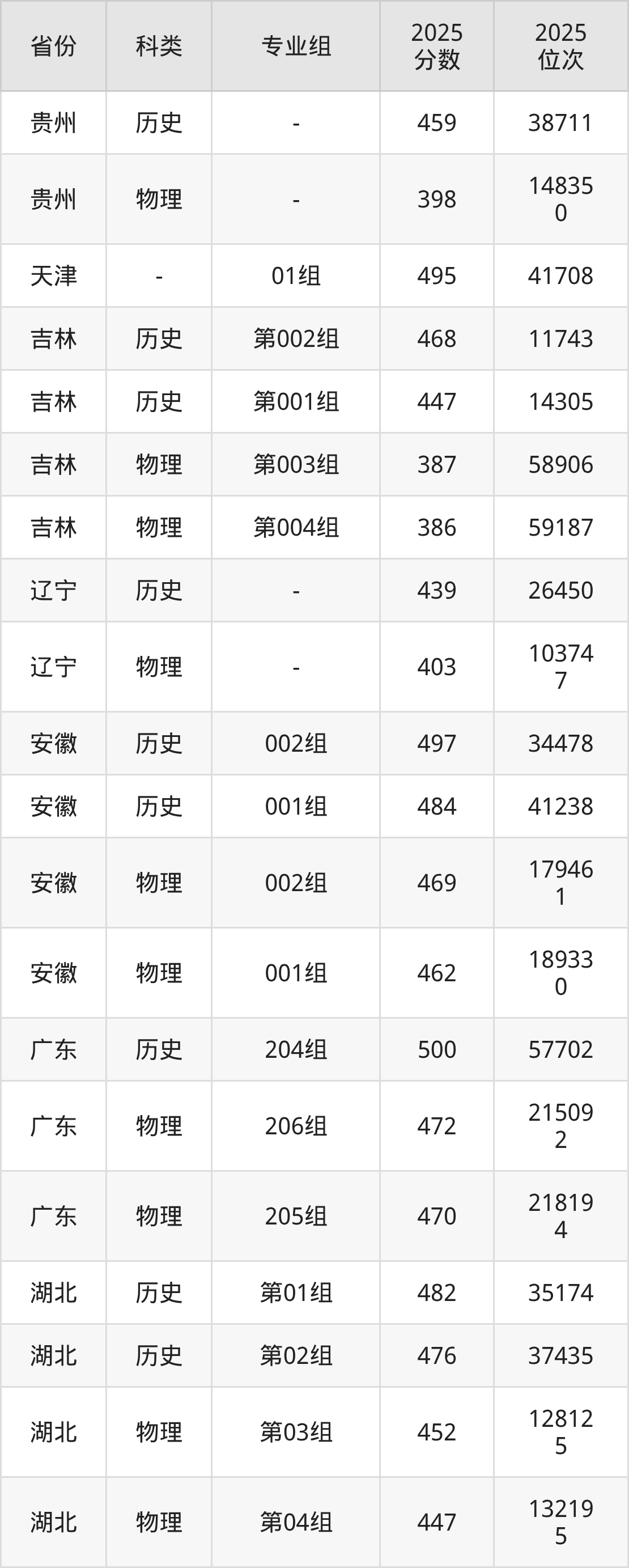 甘肃最低387分、贵州最低398分、辽宁最低403分、湖南最低407分、山西最低419分、江西最低429分、四川最低438分、湖北最低447分、福建最低452分、山东最低453分、安徽最低462分、江苏最低465分、河北最低467分、广东最低470分、天津最低495分。