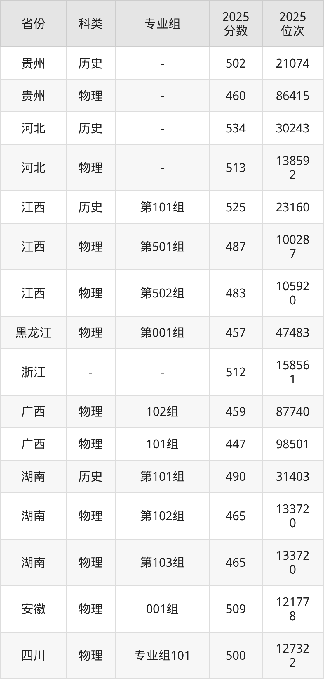 5、江西:最低分483分,对应最低分专业组为物理类第502组,位次105920名;