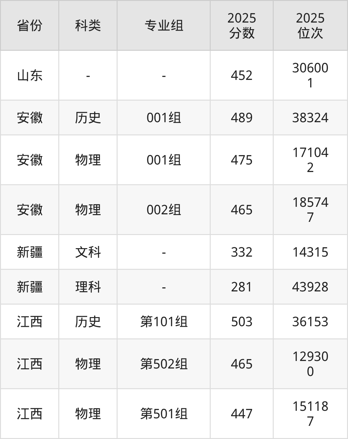 4、安徽:最低分465分,对应最低分专业组为物理类002组,位次185747名;