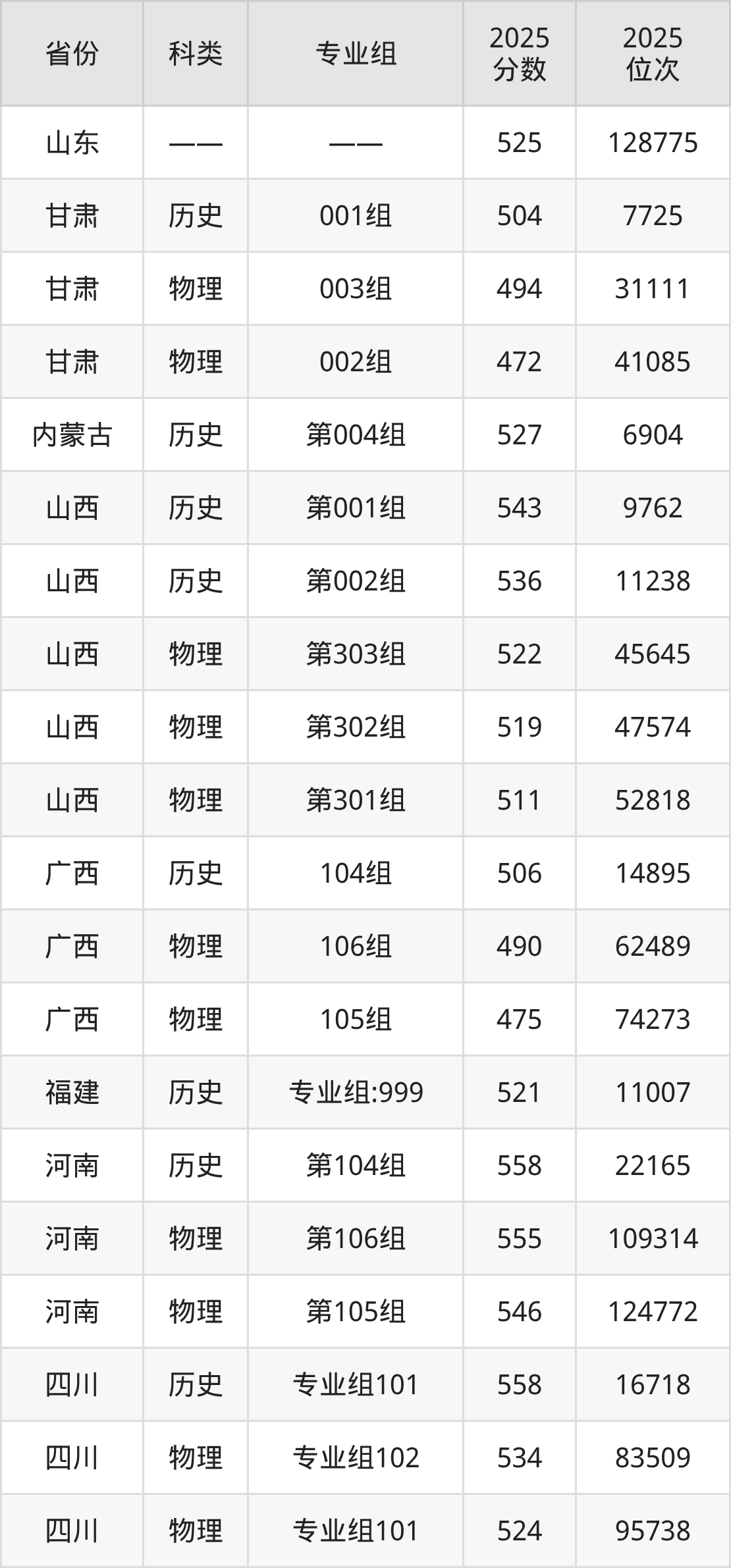 4、甘肃:最低分472分,对应最低分专业组为物理类002组,位次41085名;