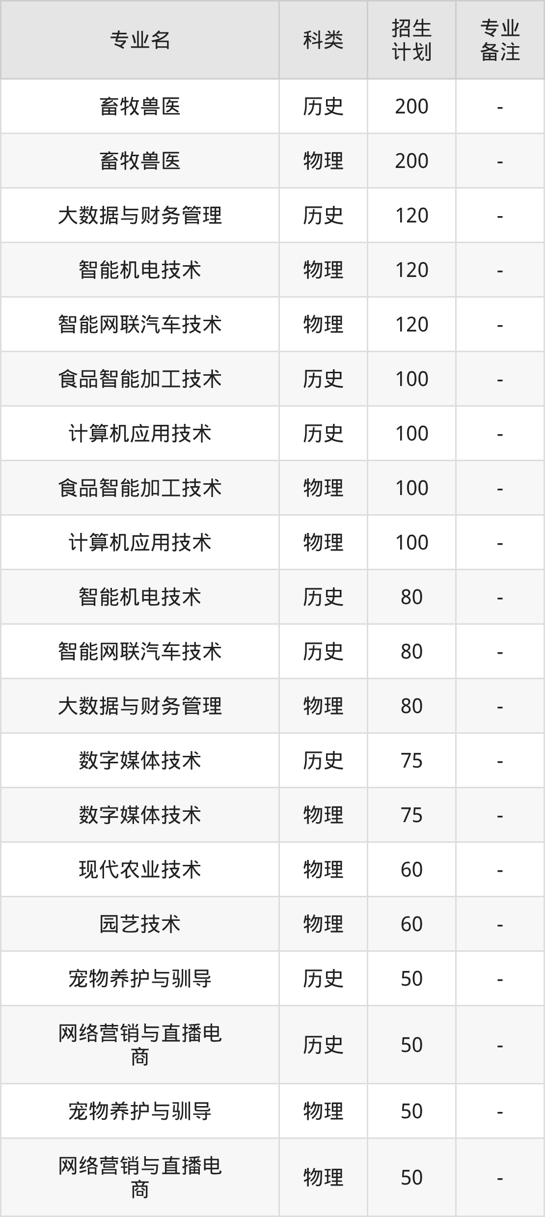 2025年驻马店农业工程职业学院仅面向全国一个省份招生:河南省2000人。招生人数最多的专业是畜牧兽医专业,学制为3年、学费为4200元,该专业选科要求为历史+不限。如果2026届考生想要报考,至少需满足该专业的基本招生要求,且最终以其最新一年招生计划为准。