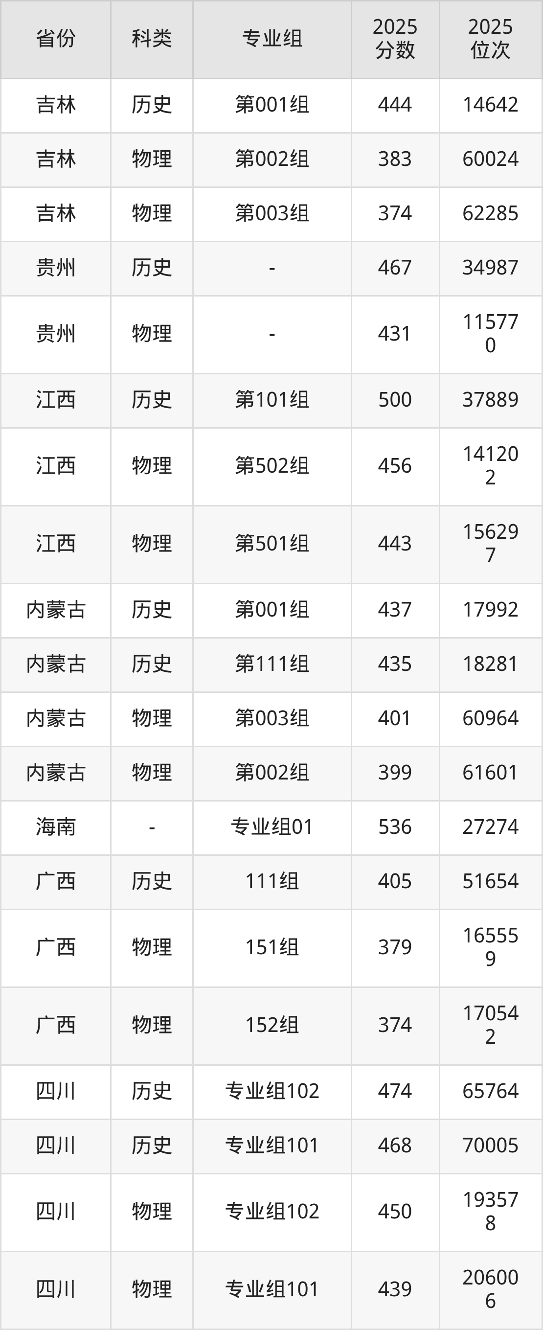 2025闽南科技学院在各省录取最低分在374分到536分之间不等,其中分数门槛最低的是广西,最高的是海南。下面展示闽南科技学院录取分数线最低的5个省份(含最低分专业组及位次):