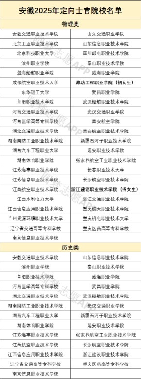 最新一年招生计划显示,定向士官在安徽省招生院校中,物理类招生院校43所、历史类招生院校25所,不同院校招生人数、专业、类型等都有差异,为方便2026届考生报考,下面将详细列举这些学校的名单,供查阅: