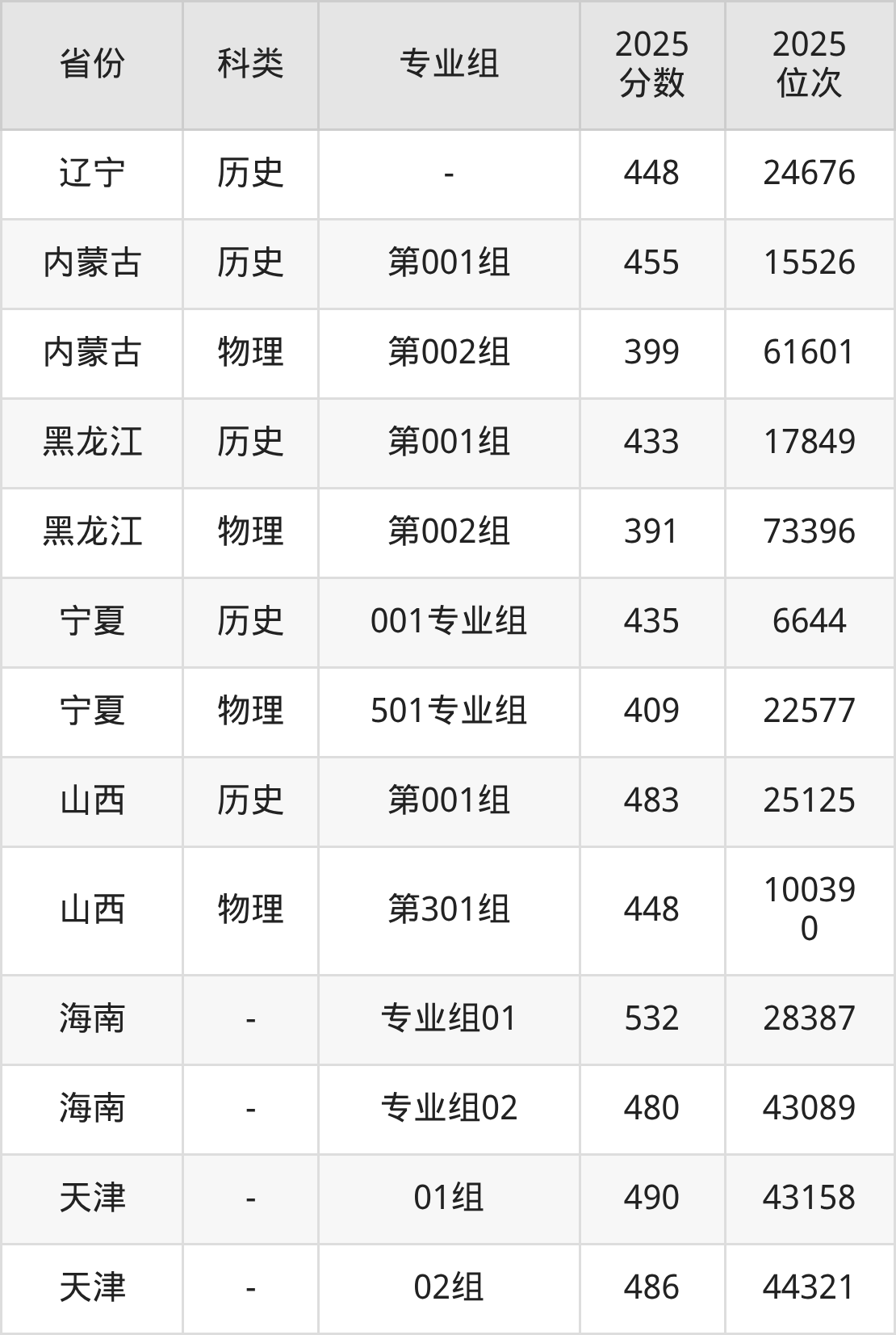 2025烟台理工学院在各省录取最低分在305分到532分之间不等,其中分数门槛最低的是新疆,最高的是江苏。下面展示烟台理工学院录取分数线最低的5个省份(含最低分专业组及位次):