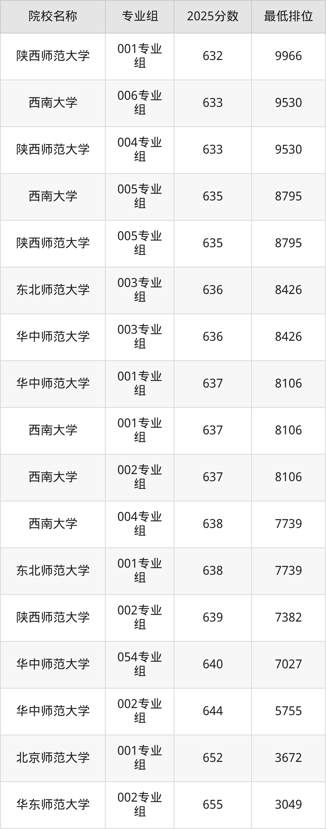 第三梯队(640分及以下):陕西师范大学(001专业组是632分)、西南大学(006专业组是633分)、陕西师范大学(004专业组是633分)、西南大学(005专业组是635分)
