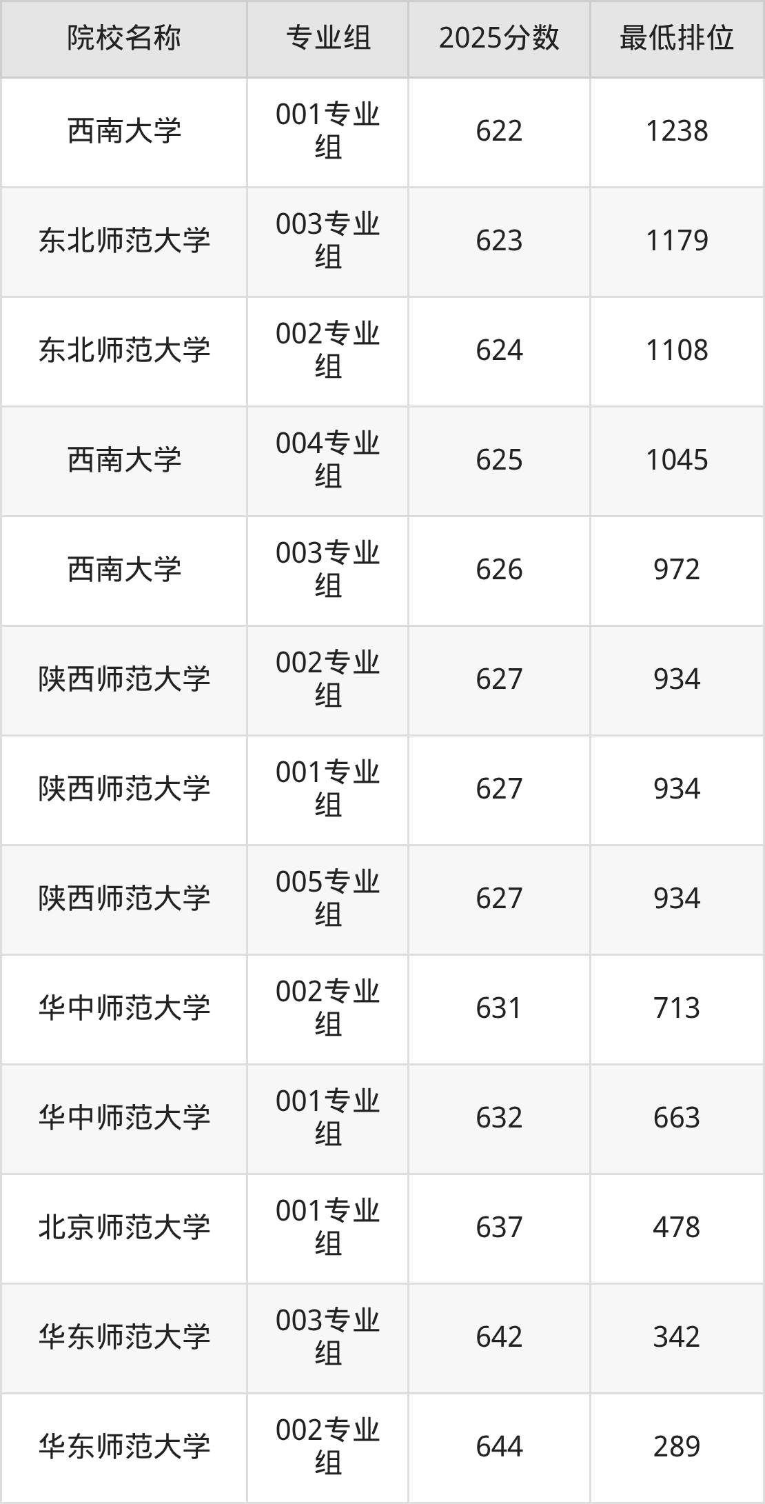第三梯队(630分及以下):西南大学(001专业组是622分)、东北师范大学(003专业组是623分)、东北师范大学(002专业组是624分)、西南大学(004专业组是625分)
