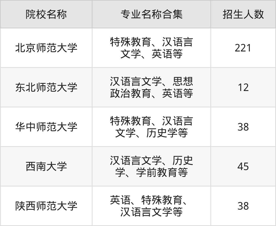 其中,北京师范大学以221人招生规模居首,西南大学45人紧随其后,华中师范大学、陕西师范大学各招38人。