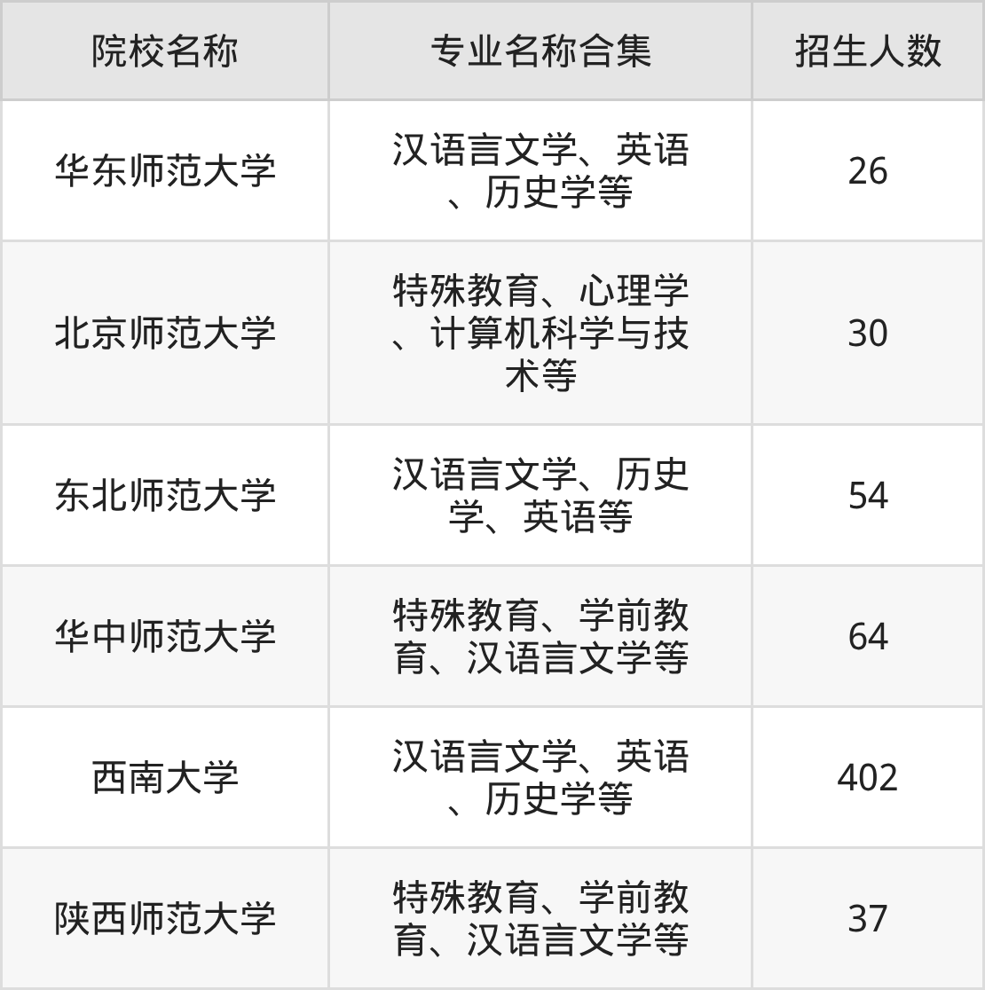 其中,西南大学以402人招生规模居首,华中师范大学64人紧随其后,东北师范大学招54人,构成招生第一梯队。
