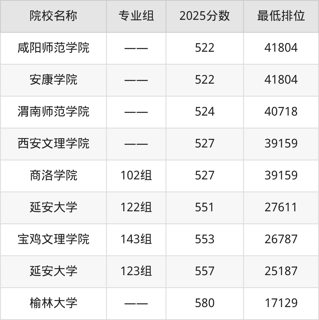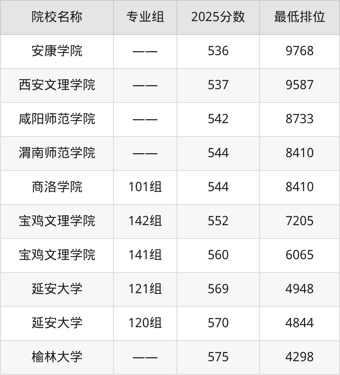 第三梯队(540分及以下):安康学院(536分)、西安文理学院(537分)