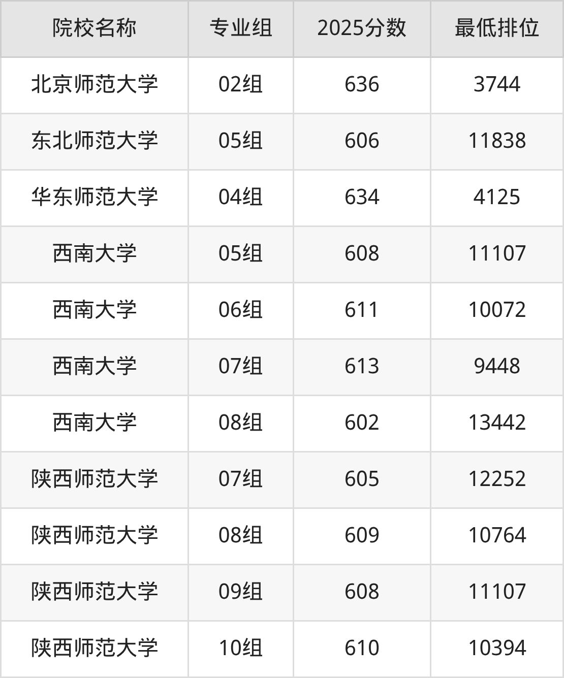 第三梯队(610分及以下):东北师范大学(05组是606分)、西南大学(05组是608分)、西南大学(08组是602分)、陕西师范大学(07组是605分)