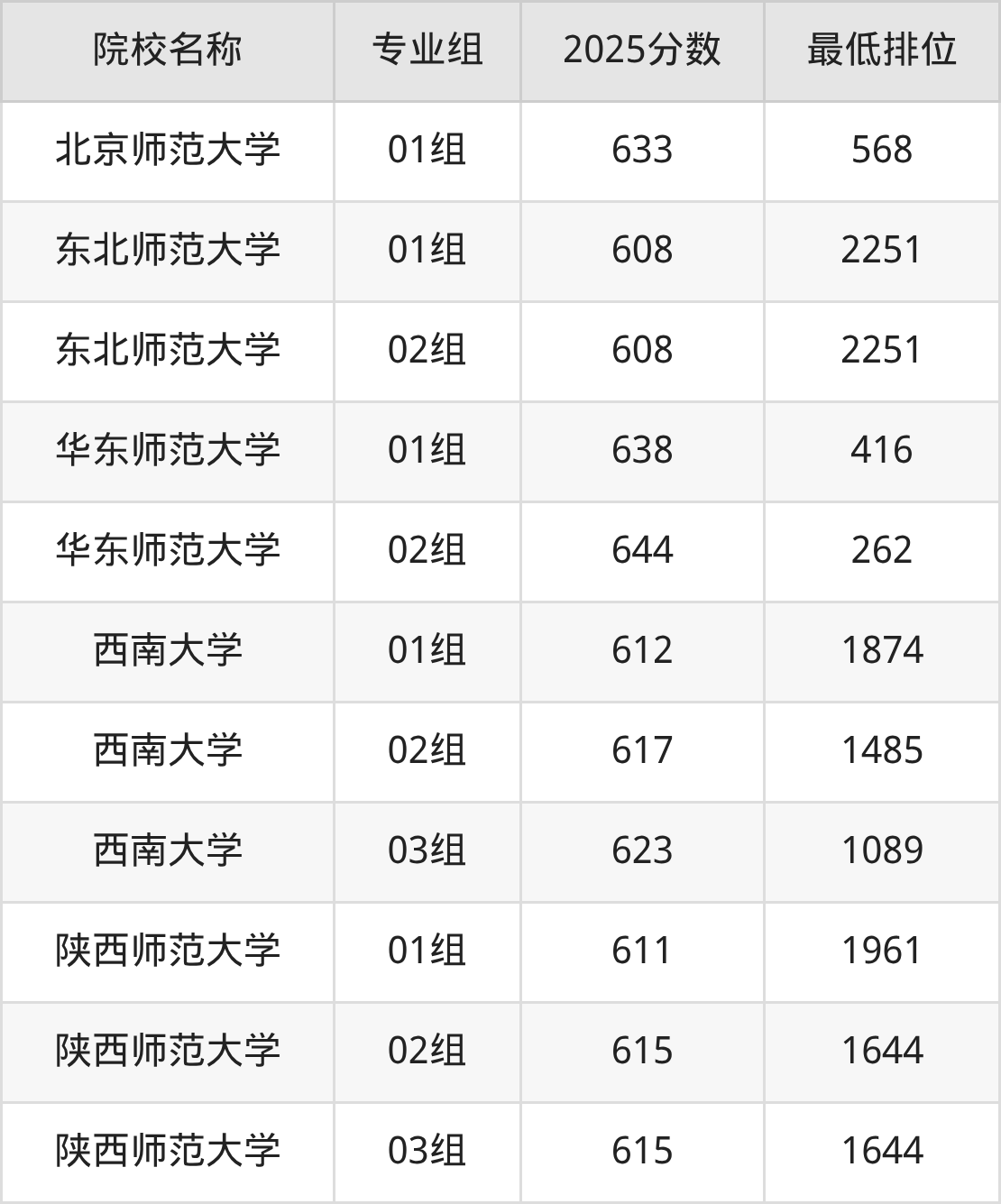 第一梯队(630分+):北京师范大学(02组是636分)、华东师范大学(04组是634分)
