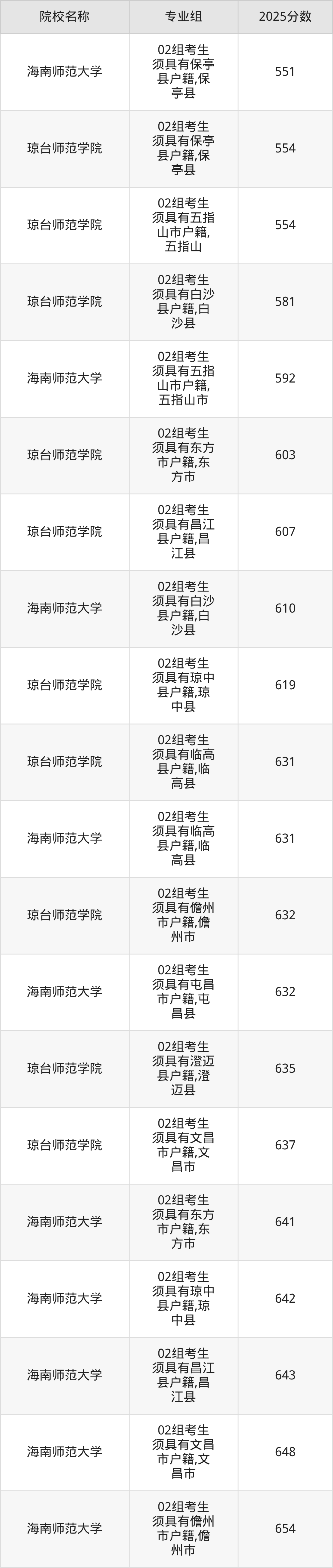 第二梯队(561-679分):琼台师范学院(02组是581分)、海南师范大学(02组是592分)、琼台师范学院(02组是603分)、琼台师范学院(02组是607分)