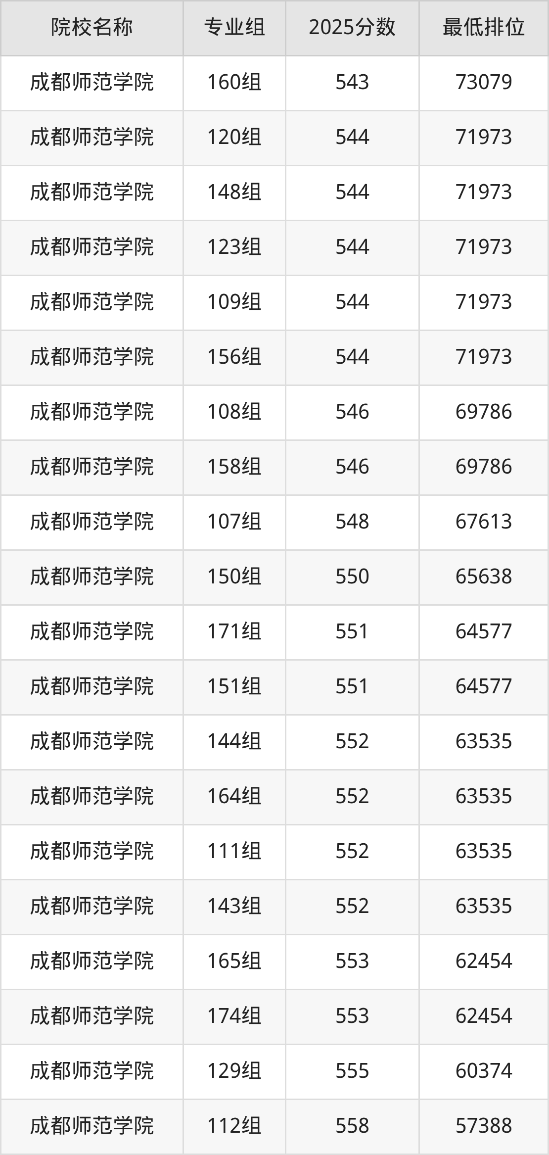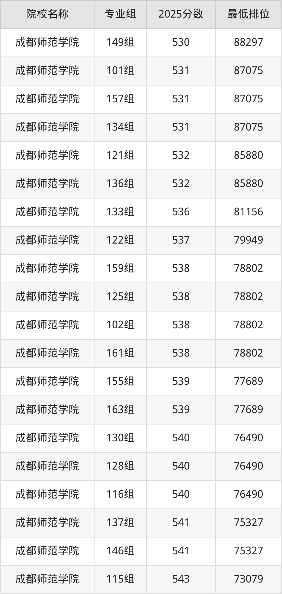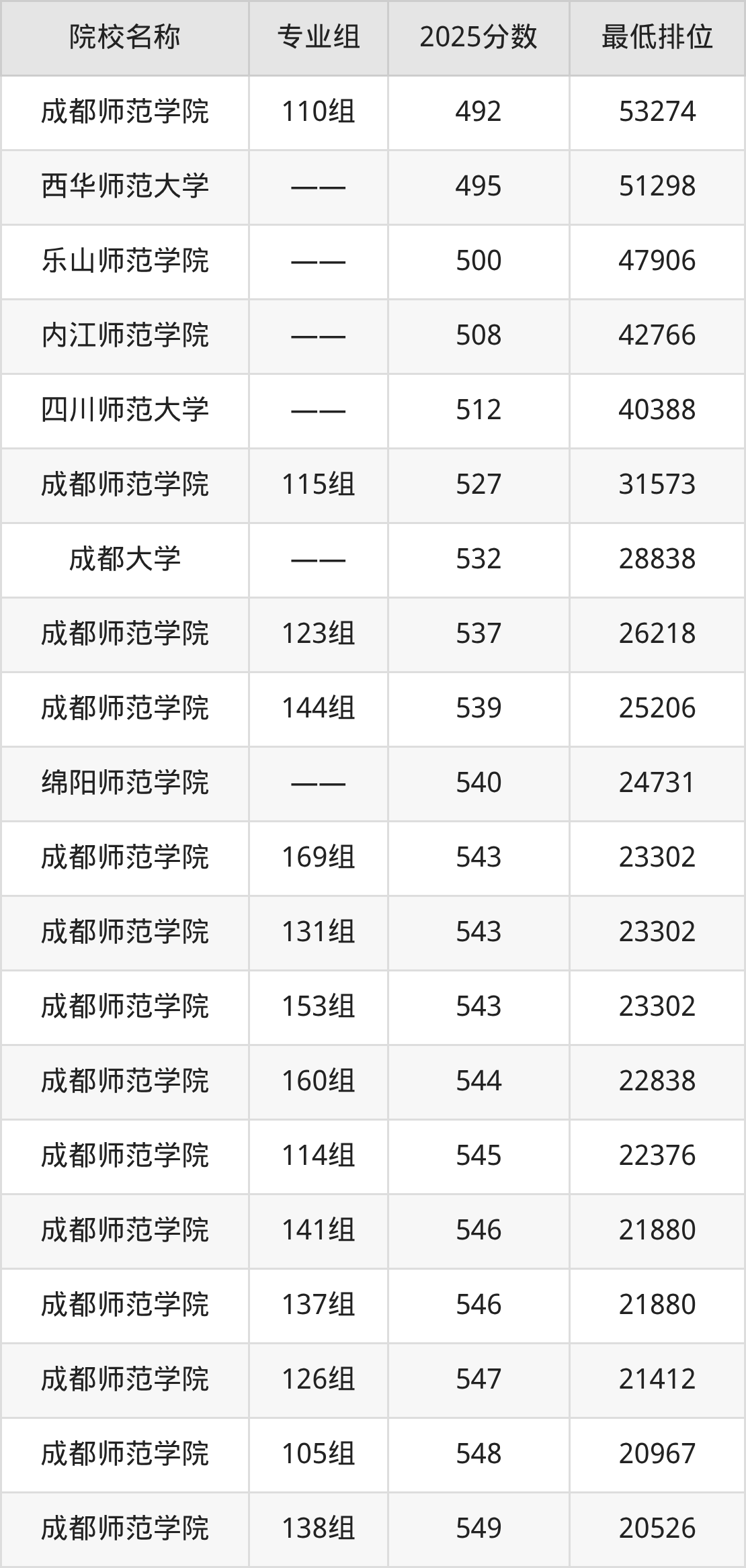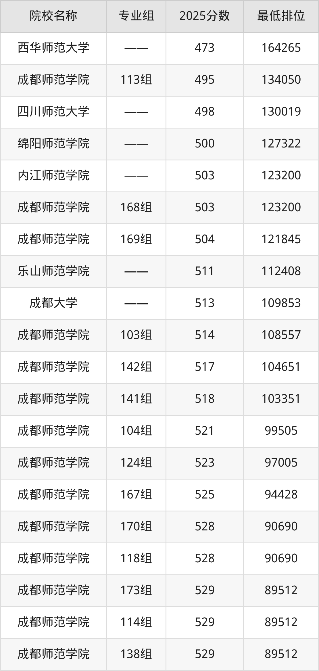 第二梯队(501-609分):内江师范学院(508分)、四川师范大学(512分)、成都师范学院(115组是527分)、成都大学(532分)