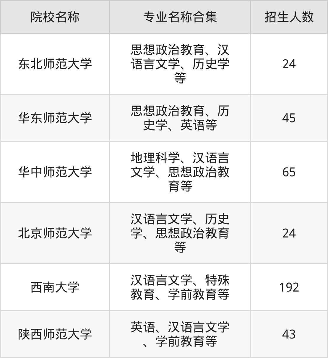 其中,西南大学以192人招生规模居首,华中师范大学65人紧随其后,华东师范大学招45人,构成招生第一梯队。
