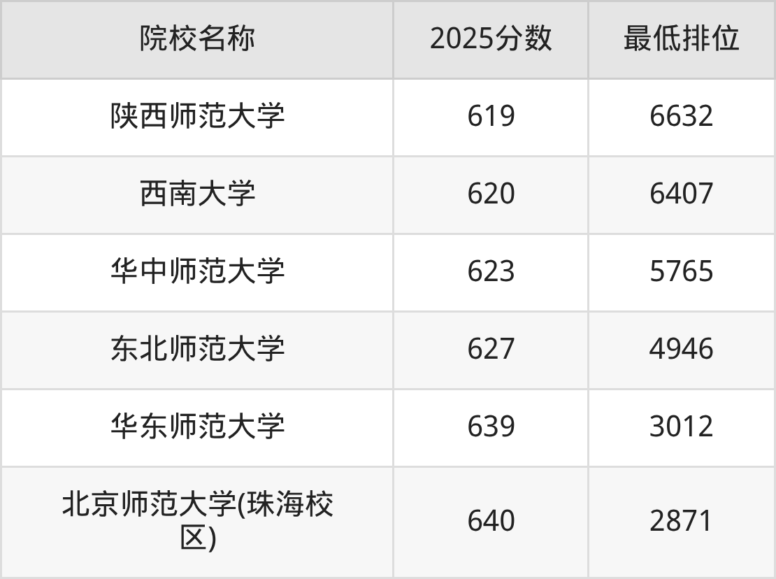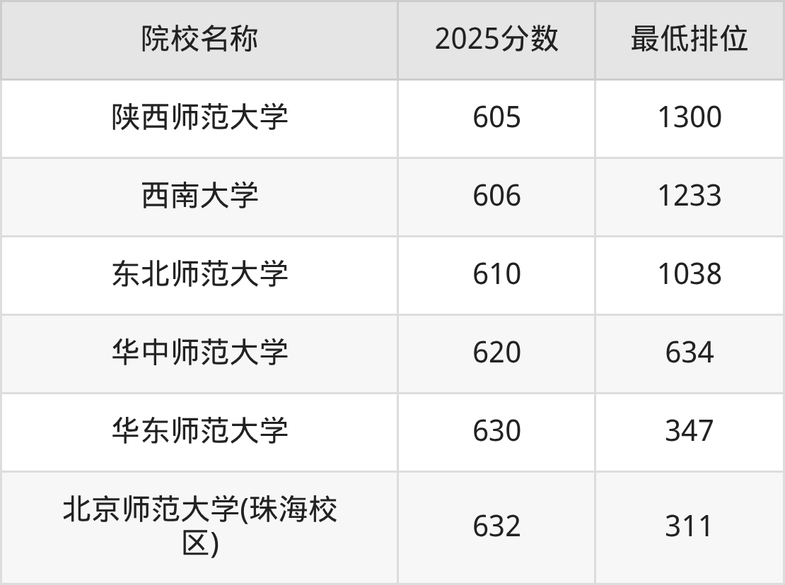 第三梯队(610分及以下):陕西师范大学(605分)、西南大学(606分)、东北师范大学(610分)