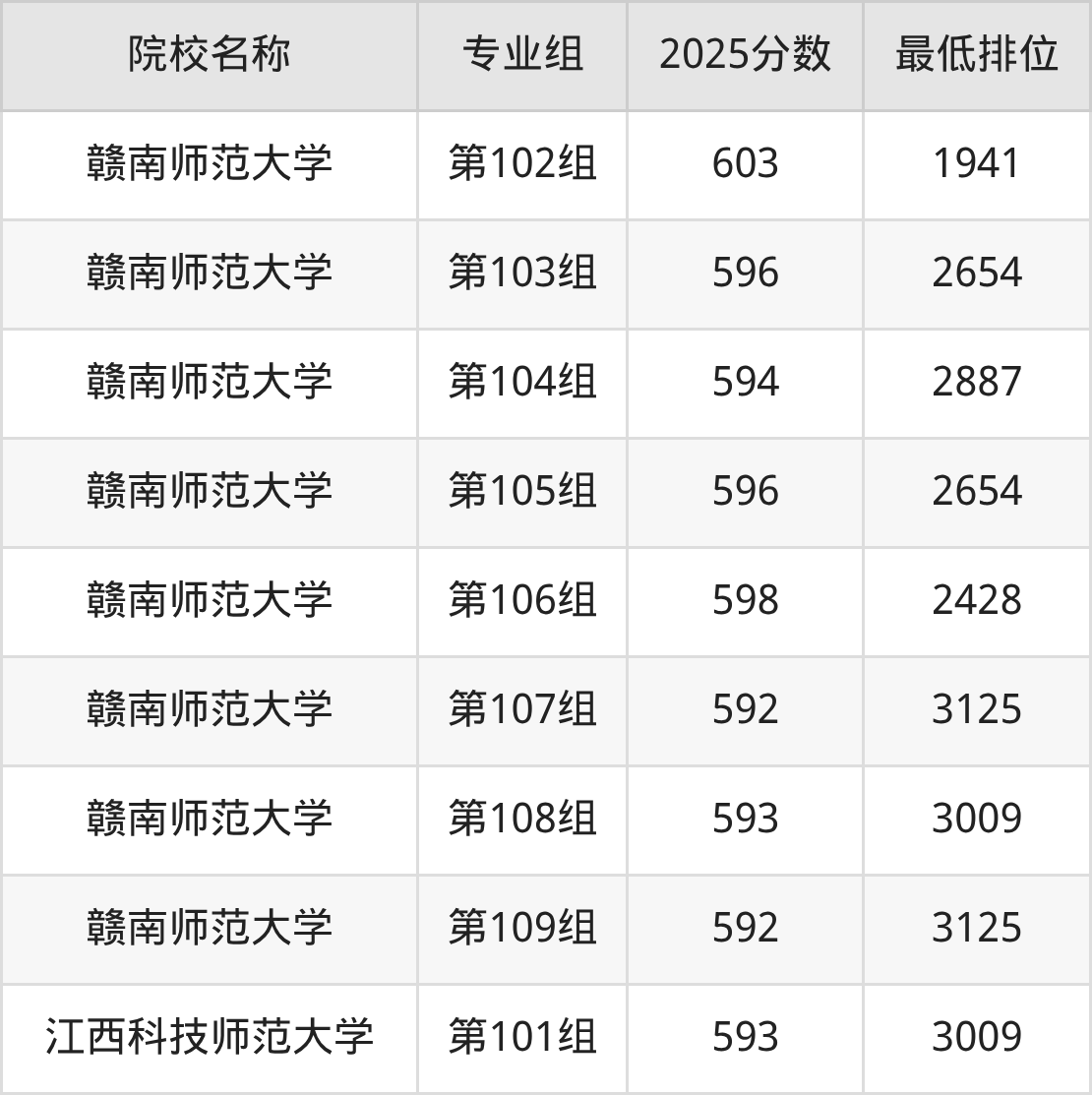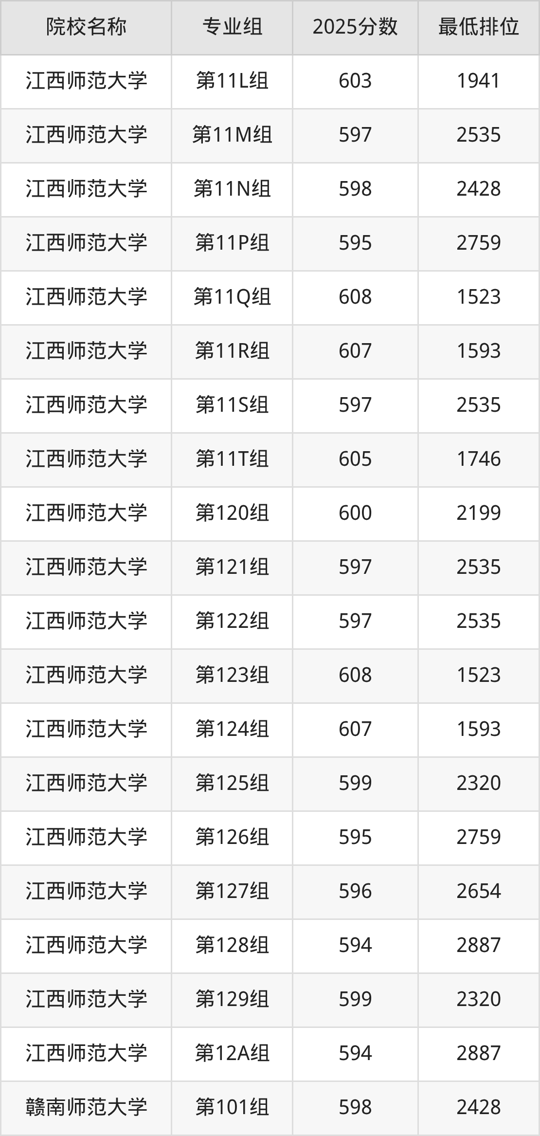 第一梯队(610分+):江西师范大学(第110组是612分)、江西师范大学(第114组是610分)、江西师范大学(第115组是614分)