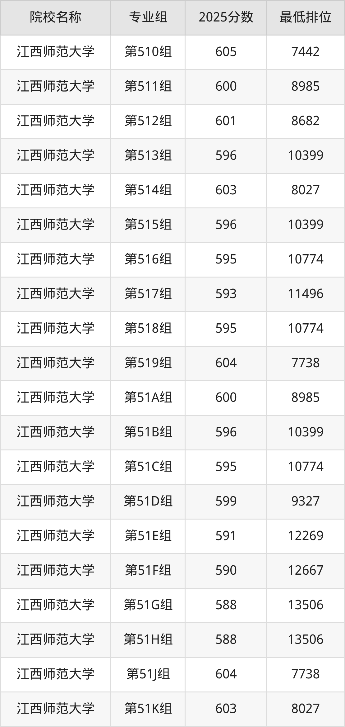 第一梯队(600分+):江西师范大学(第510组是605分)、江西师范大学(第511组是600分)、江西师范大学(第512组是601分)、江西师范大学(第514组是603分)