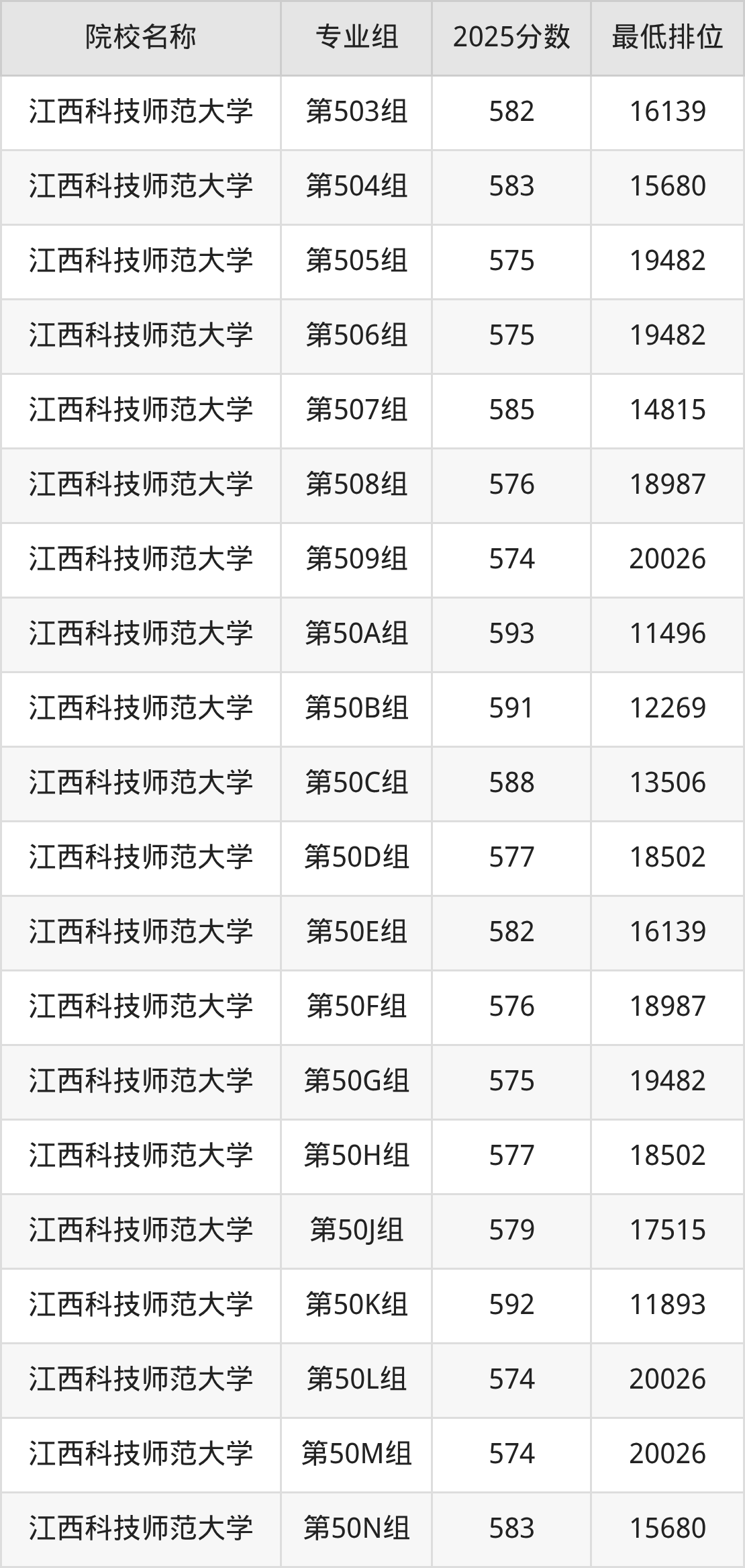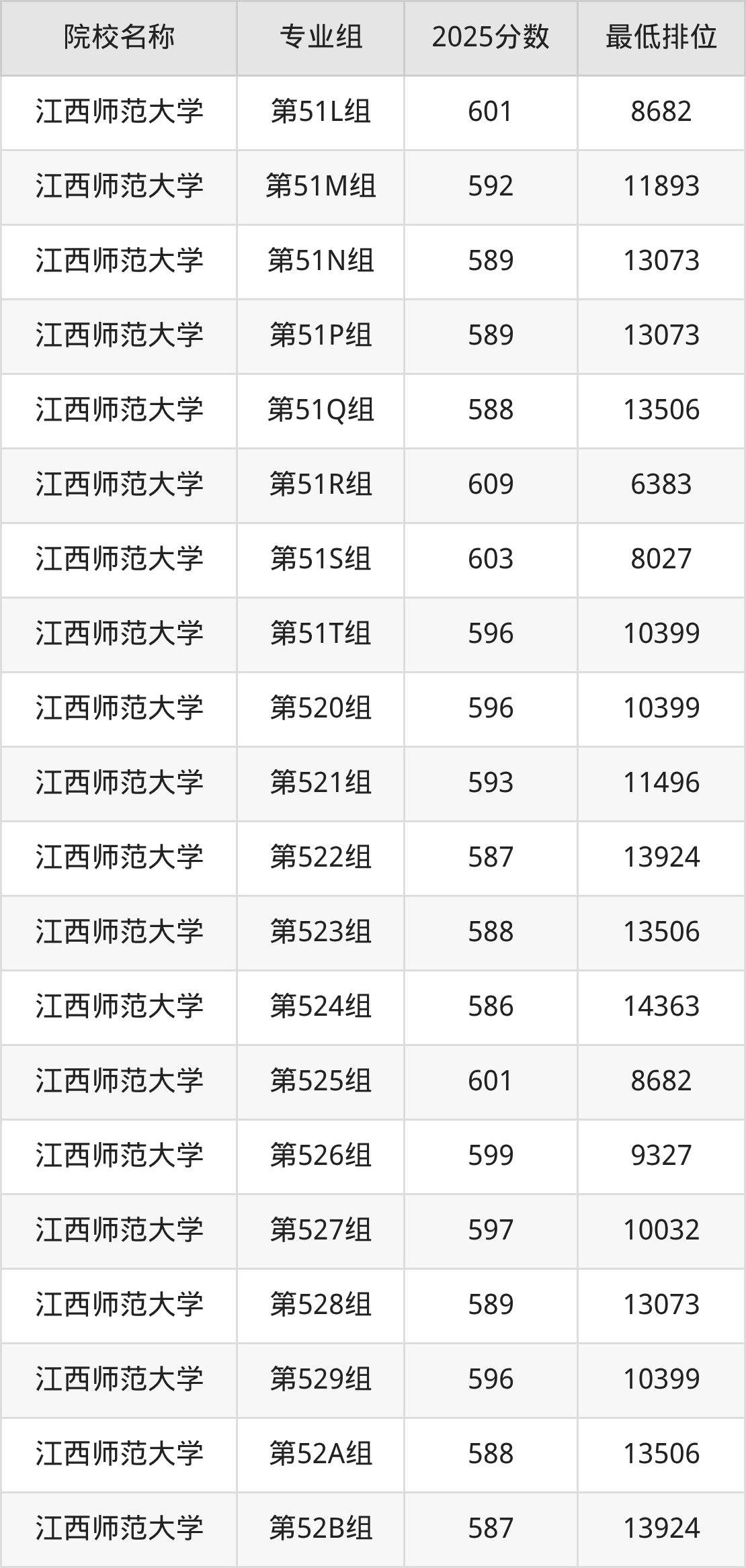 第二梯队(581-599分):江西师范大学(第513组是596分)、江西师范大学(第515组是596分)、江西师范大学(第516组是595分)、江西师范大学(第517组是593分)