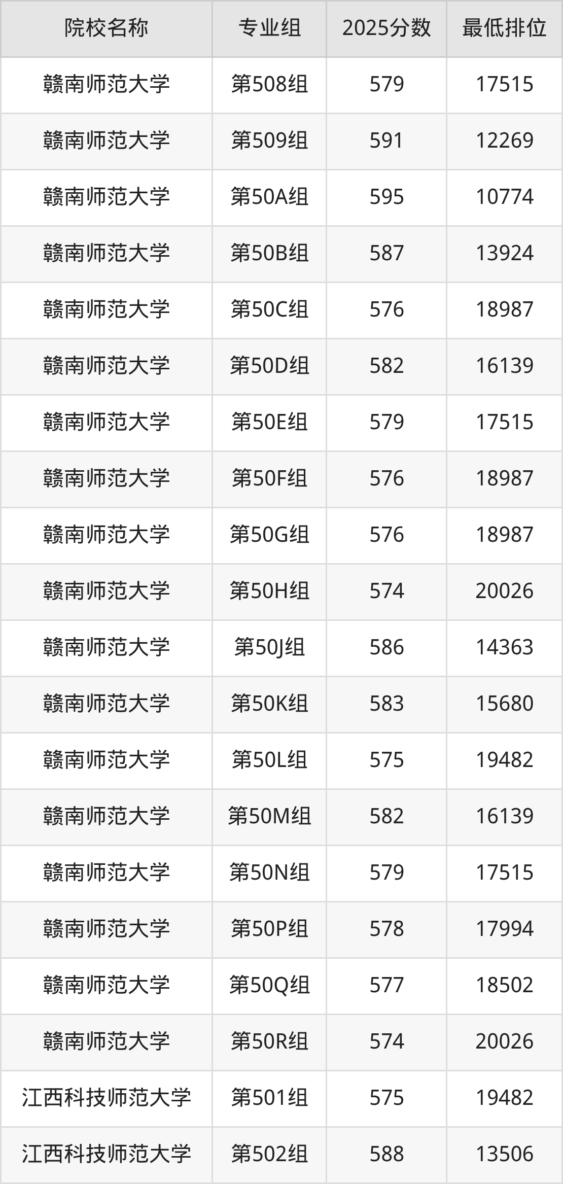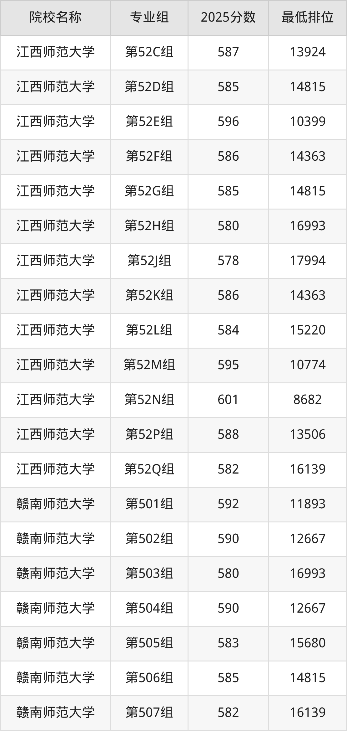 第三梯队(580分及以下):江西师范大学(第52H组是580分)、江西师范大学(第52J组是578分)、赣南师范大学(第503组是580分)、赣南师范大学(第508组是579分)
