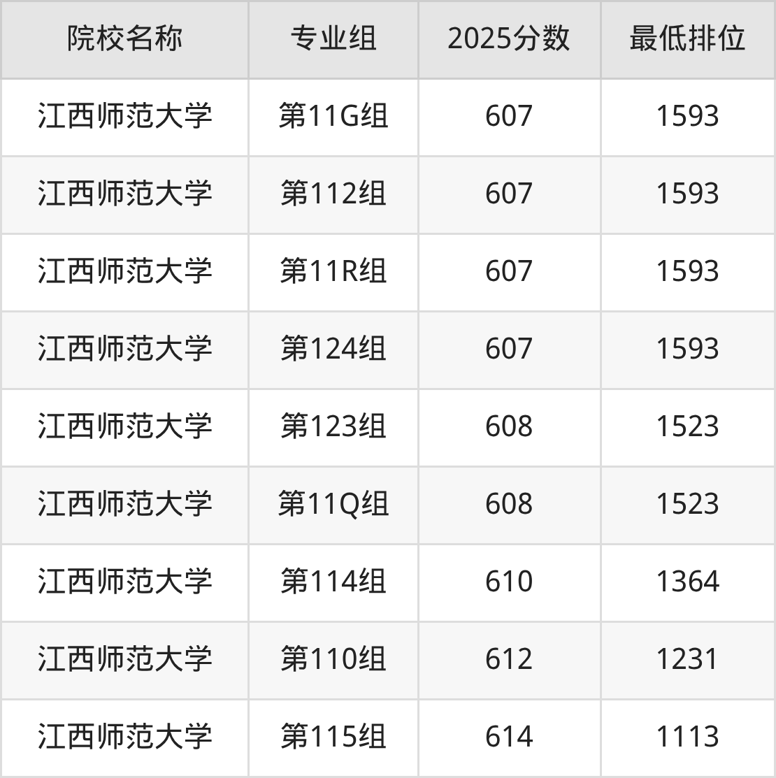 第一梯队(610分+):江西师范大学(第114组是610分)、江西师范大学(第110组是612分)、江西师范大学(第115组是614分)