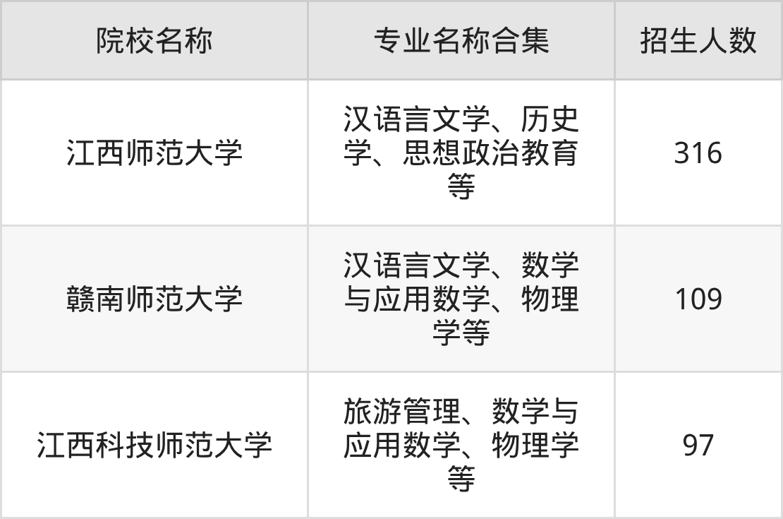 其中,江西师范大学以316人招生规模居首,赣南师范大学109人紧随其后,江西科技师范大学招97人。