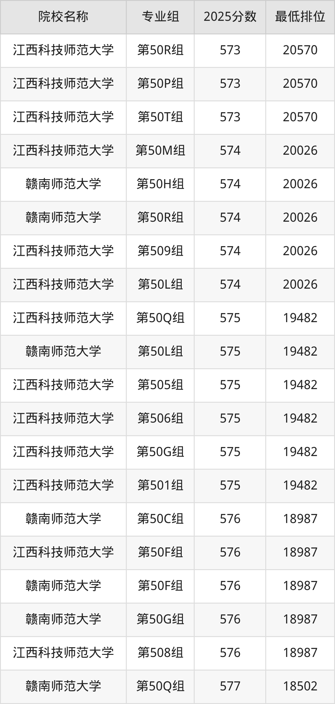 第三梯队(580分及以下):江西科技师范大学(第50R组是573分)、江西科技师范大学(第50P组是573分)、江西科技师范大学(第50T组是573分)、江西科技师范大学(第50M组是574分)